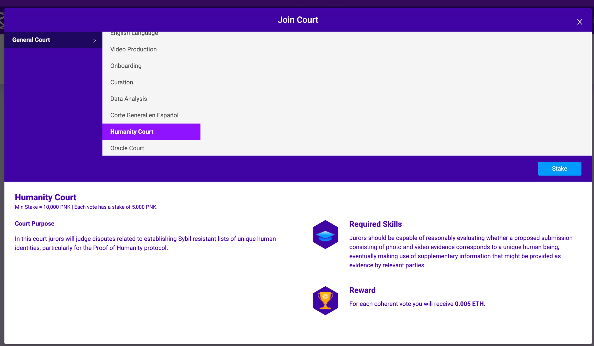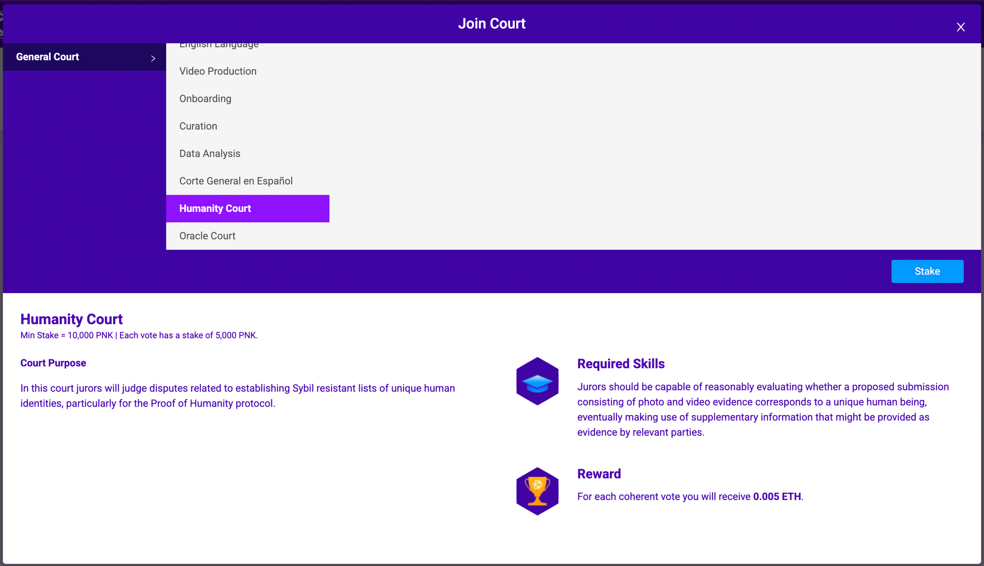 Court Purpose: "In this court jurors will judge disputes related to establishing Sybil resistant lists of unique human identities, particularly for the Proof of Humanity protocol."