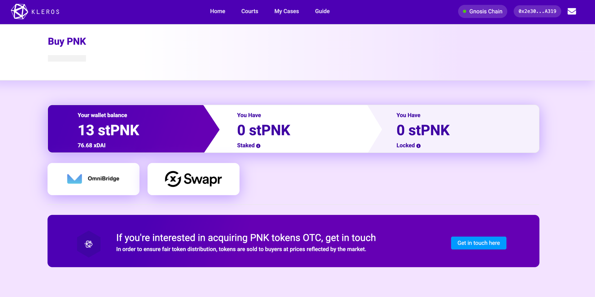 Display Note: On Gnosis Chain, the interface displays your tokens as stPNK (staked PNK). This is the same token with a different display name.