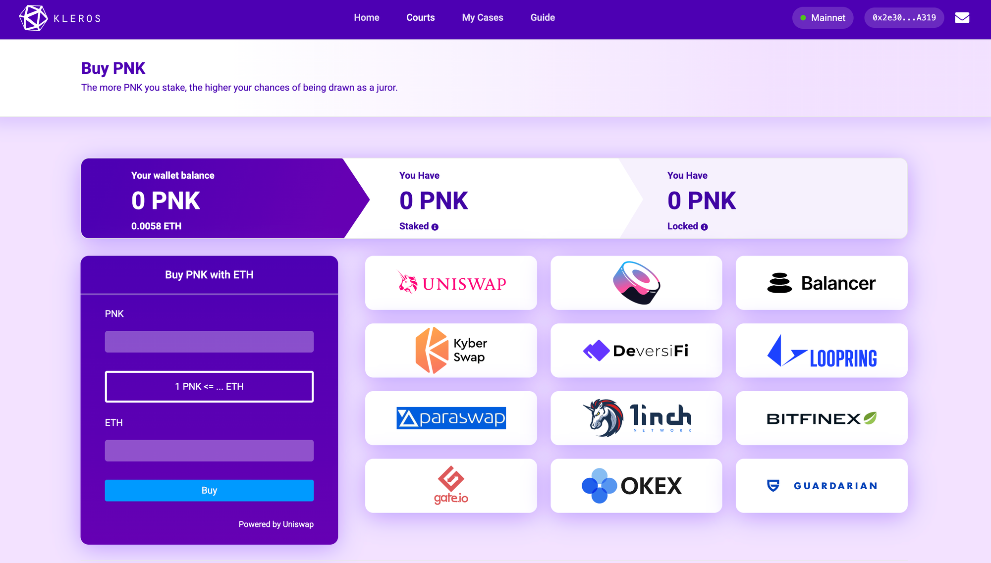 Navigate to the Buy PNK page on court.kleros.io while connected to Ethereum Mainnet.