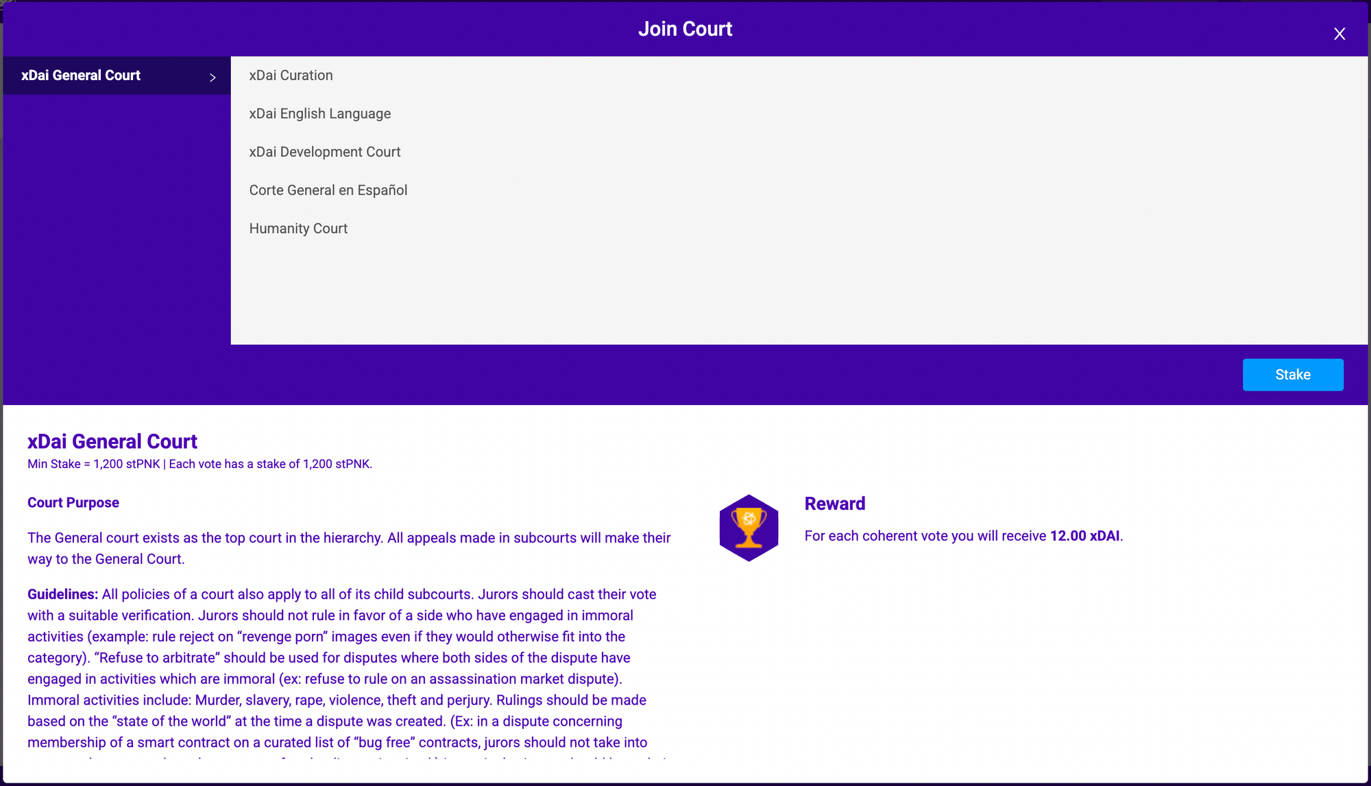 - Min Stake: Minimum required to join the court
