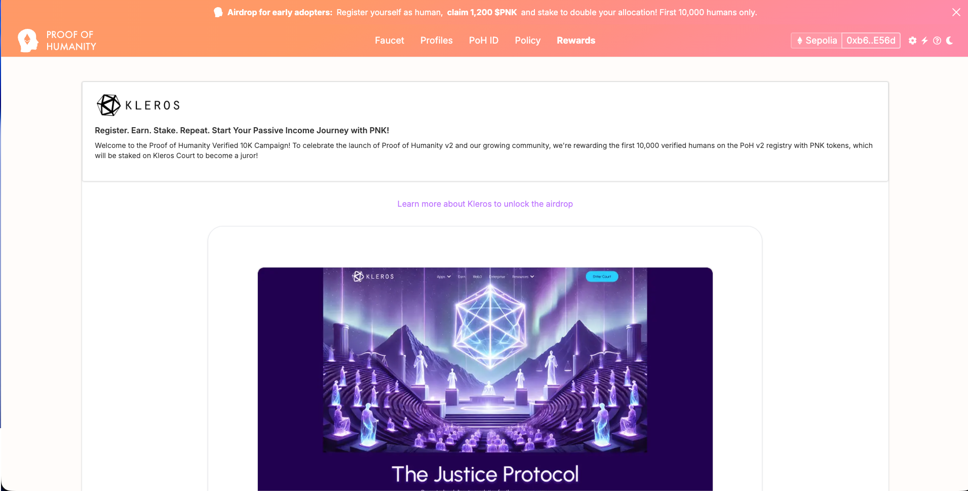 If you're claiming PNK from the airdrop, a Claim + Stake option is available for the first 10,000 PoH registrants. This allows you to claim your airdrop and stake directly to Humanity Court in a single transaction.
