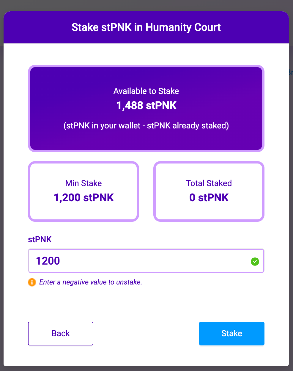 On Gnosis Chain, enter a negative value in the staking input to unstake. For example, enter -1200 to unstake 1,200 stPNK.