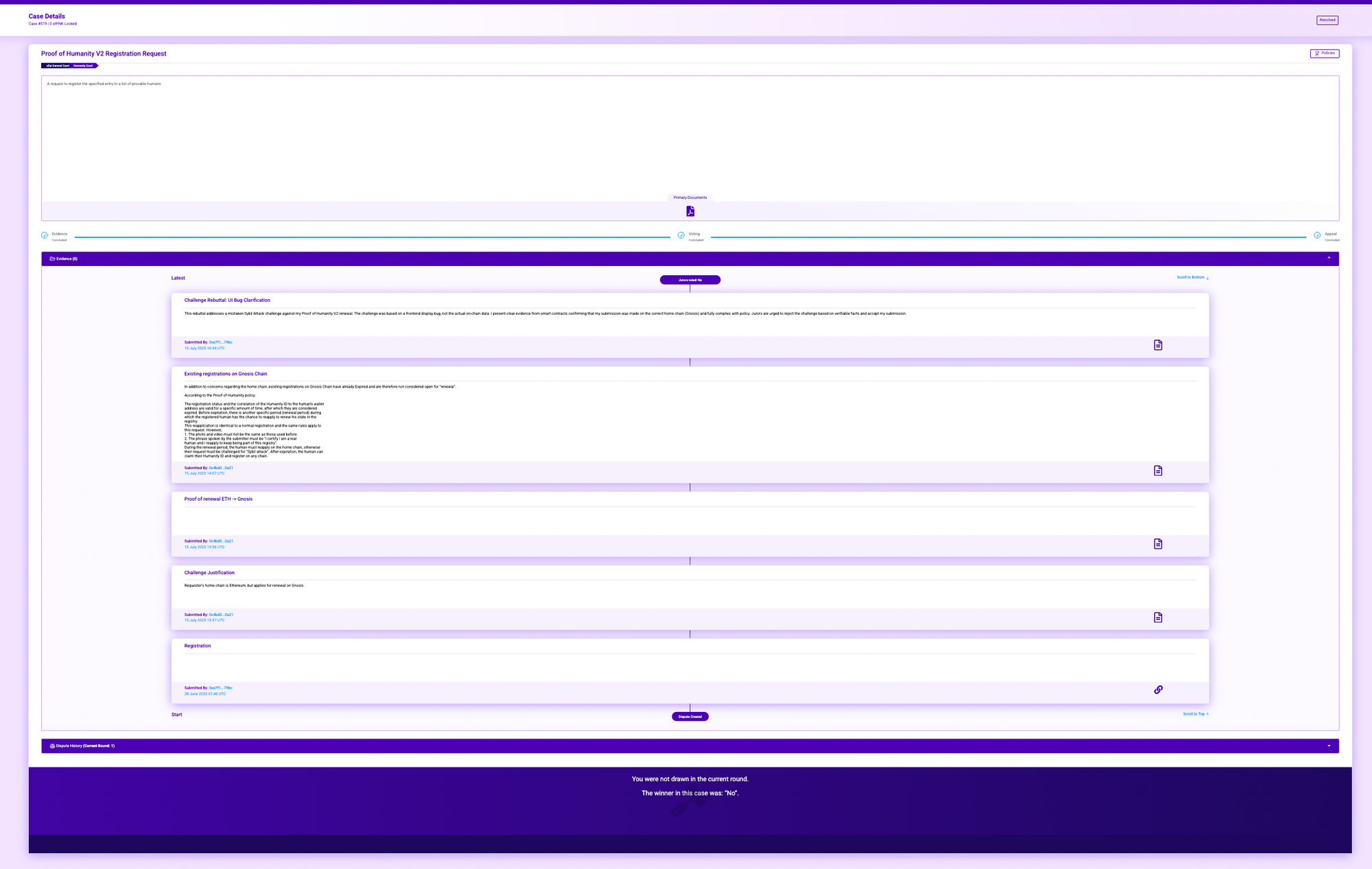 Note: The Humanity Court on Arbitrum (Court V2) is NOT connected to Proof of Humanity. PoH disputes are only resolved on Gnosis Chain and Ethereum Mainnet.
