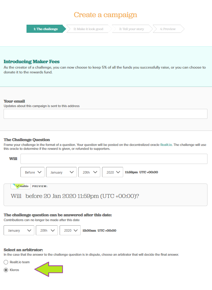- Campaigns should designate Kleros as their arbitrator. All campaigns are eligible, regardless of their state (Success/Refunding/Active).