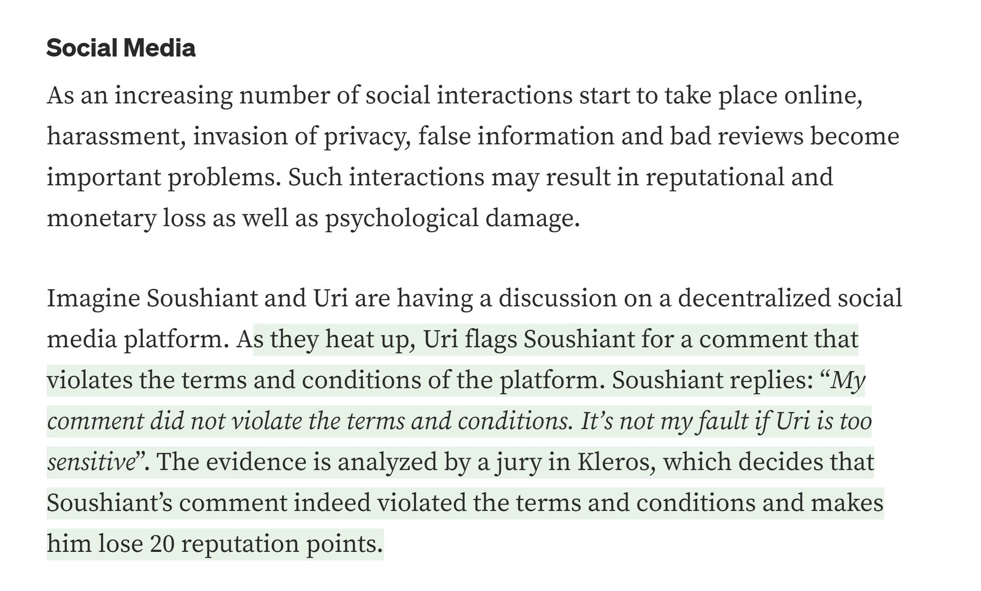 At Kleros, we have been thinking about these problems for a long time, so its useful to look back and see what approaches Kleros envisaged to tackle this complex problem and what solutions we offered. In our first white paper we wrote with Clément back in 2017 (6 years ago!), we identified social media disputes as a key field for decentralized justice.