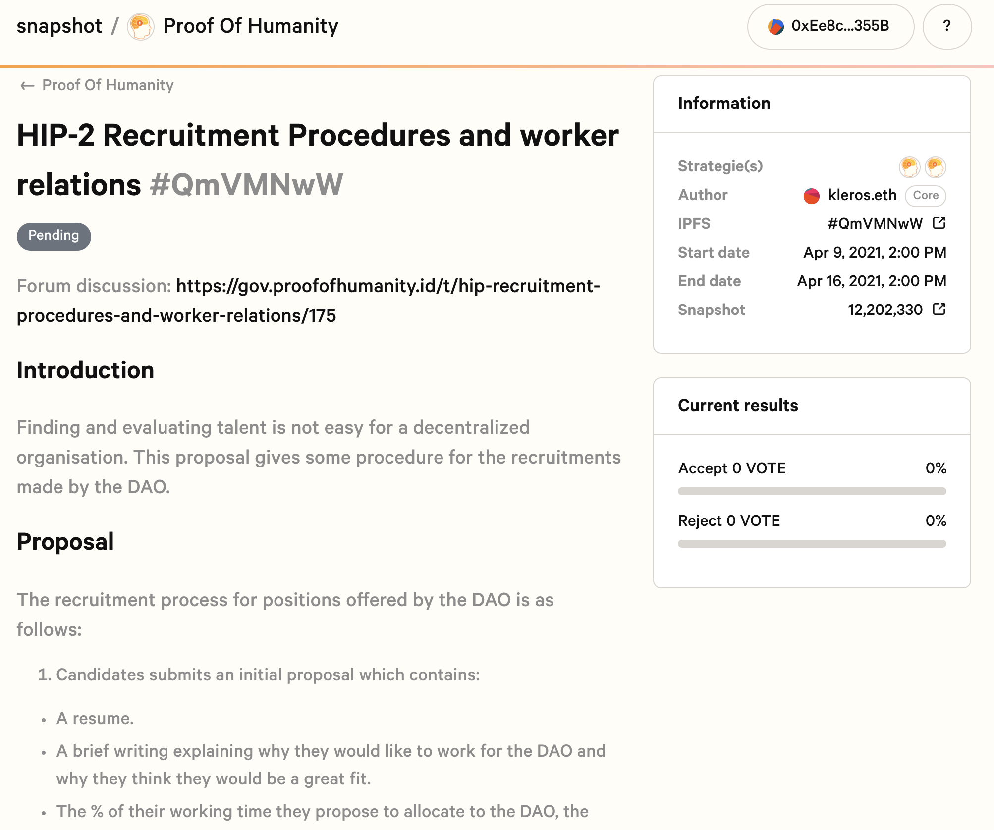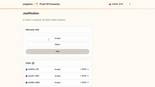 - Make sure to connect with the same Ethereum address that you have used to register in the Proof of Humanity registry. Otherwise, you will still be able to vote, but your vote will not be counted in the final tally.