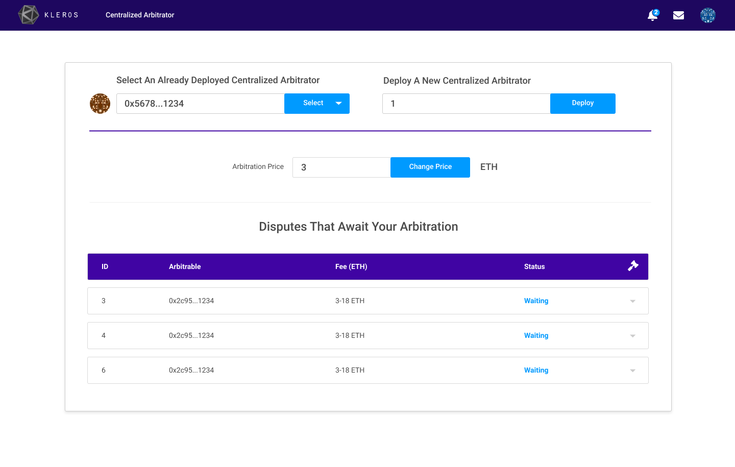 The centralized arbitrator is an arbitrator controlled by a single account that rules directly. This can be used to test arbitrable contracts, or in set ups where off chain software computes the ruling and needs to bring it on-chain, or when a platform (e.g., a crypto e-commerce or exchange platform) needs to be able to overrule the enforcement of Kleros' decisions.
