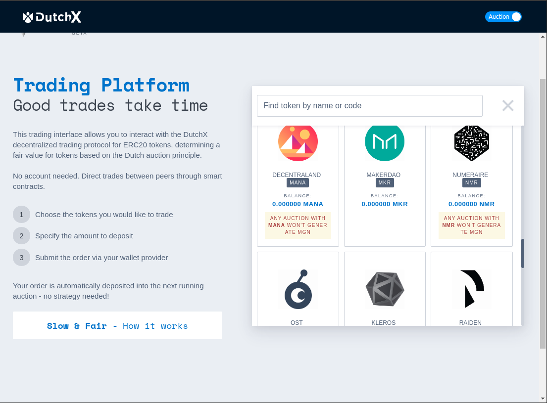 - DutchX: To simplify and speedup its token listing process, the DutchX exchange simply plugs into the already populated T²CR of ERC20 tokens. No one needs to ask for Kleros or dxDAO permission to get their tokens listed or open pull requests. Likewise, there is no one that can be compelled to censor or prevent a token from making it into the exchange. Additionally, a token token that complies with the DutchX listing criteria can request the DutchX badge to be displayed first in the exchange.