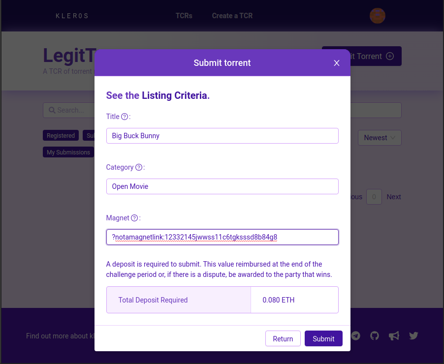 - Content Addressing: “What if we make a torrent registry of malware free files? Torrents on the blockchain would be quite hard to take down right? Could we make one that accepts IPFS links for other Dapps as well? Also how about a TCR of TCRs to make navigating the whole thing easier?”