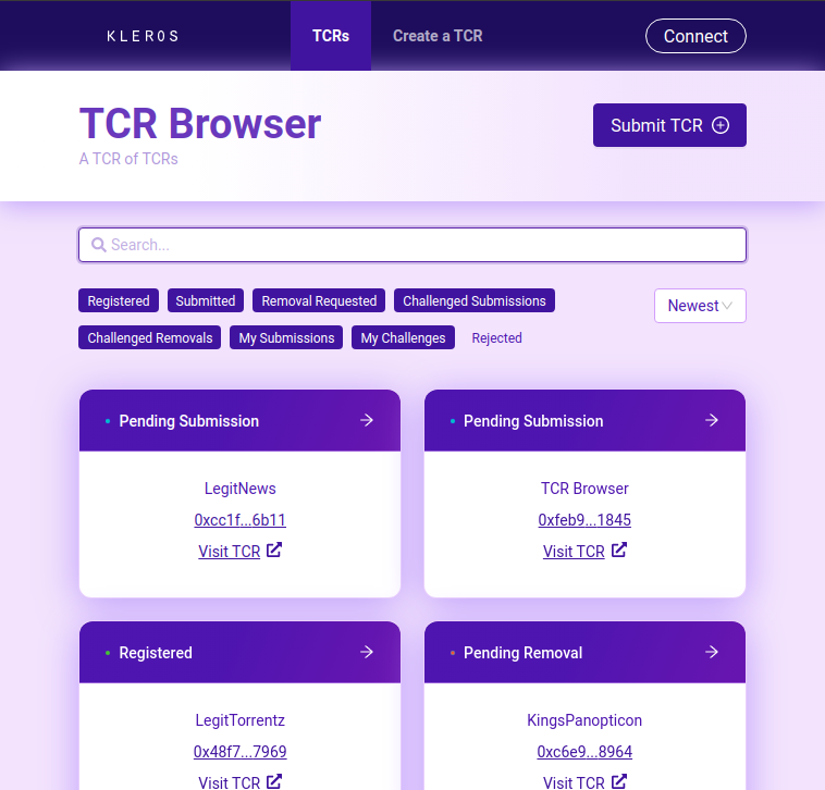 In 2019, Kleros deployed six TCRs related to token listings, which were used to ensure code quality, exchange compliance and fraud detection. The T²CR and its badges demonstrated that the space can self-regulate and punish projects which attempt to violate listing rules.