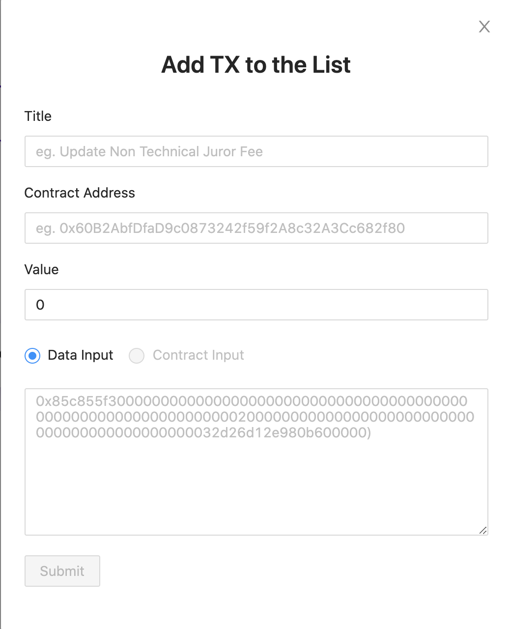 Note: the Kleros Cooperative will likely provide the fees needed by the governor transactions, but anyone can do it. - The raw hex data. This is inputted to tell the smart contract exactly what needs to be done. In this example, we have the function signature for changeSubcourtJurorFee followed by its values for the two parameters _subcourtID and _feeForJuror which are 0 and 100000000000000000 respectively.