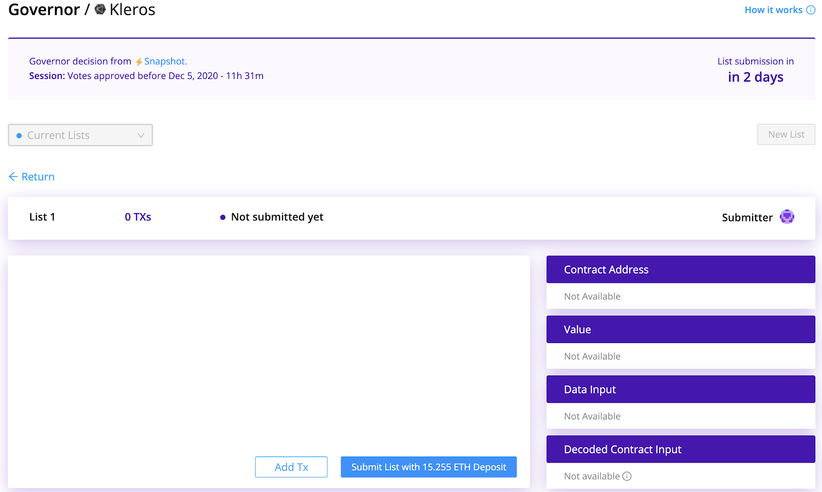 A user submits a list of transactions to be executed by the governor contract at the end of the session. If there is only one list submitted for the session, it will be accepted and the deposit is returned to the submitter.