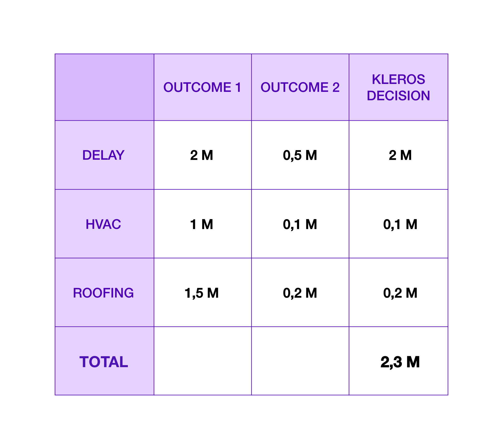 ABC and XYZ, with the mediator's assistance, submit the binary outcomes along with relevant evidence to Kleros. Evidence might include the original contract, emails discussing project changes, expert reports on the HVAC system and the roofing, etc.