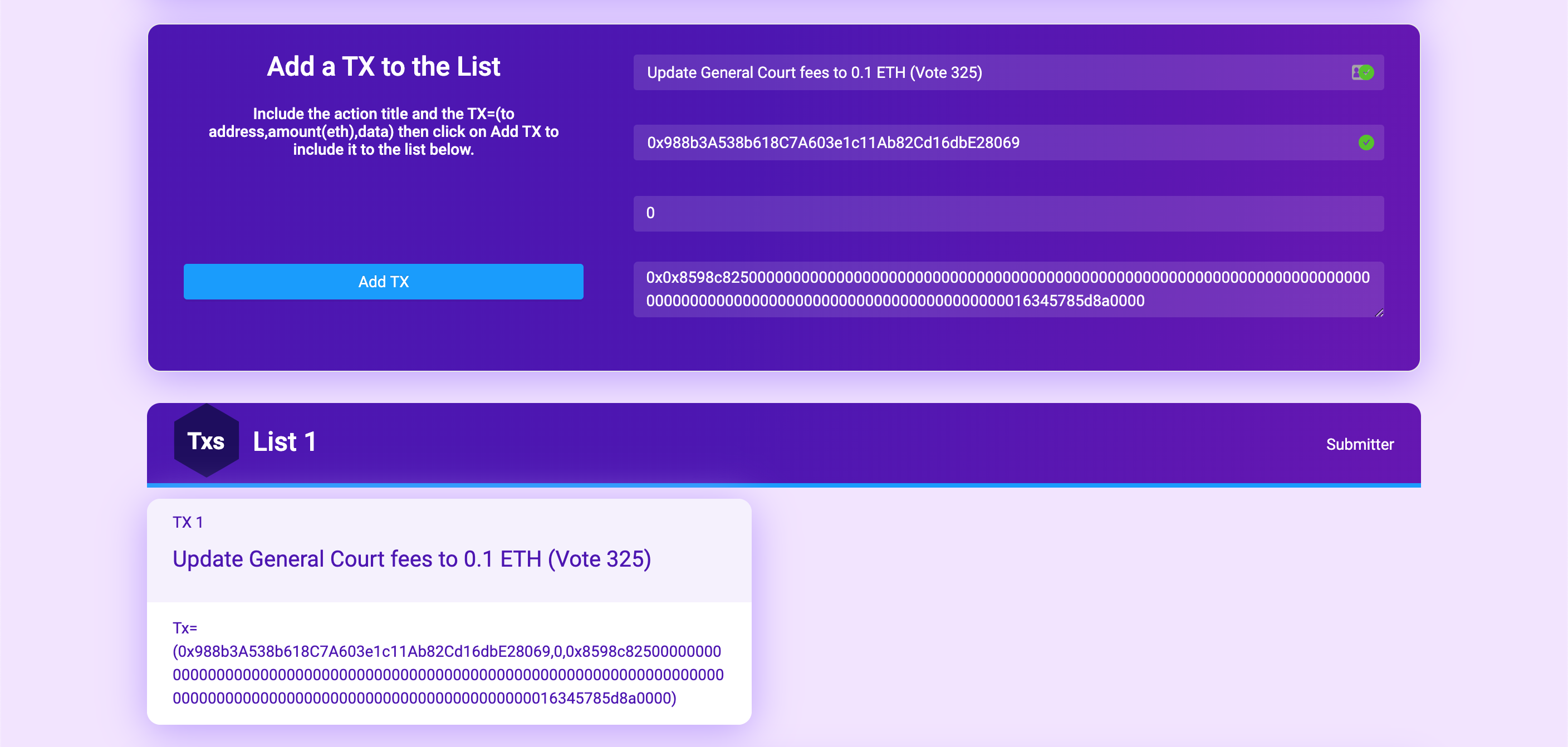 - Set an ETH amount that will be sent with the transaction. In this case changing the subcourt juror fee does not require any ETH, so we put 0 (zero). In a case when ETH is required, it can be entered in this field, but the submitter does not have to pay it. After a list has been accepted, another contract interaction is needed to execute the list and supply the payment needed execute the calls.
