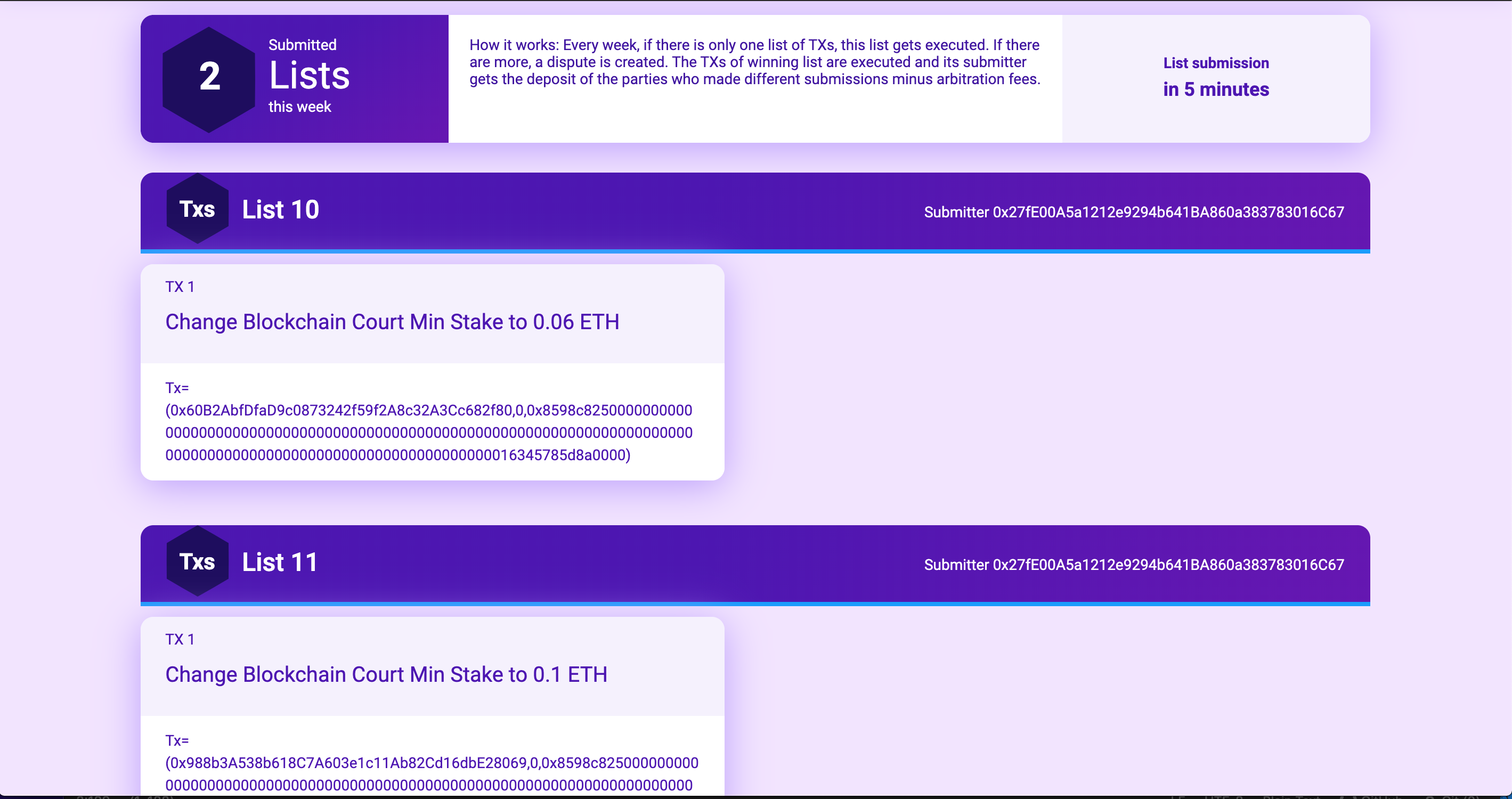 As we touched on before, if more than one List is submitted in a period, a dispute is automatically created and sent to Kleros Court. Jurors will look over all of the lists submitted and decide which one reflects the correct changes that were voted upon. The Governor will not allow new list submissions until a dispute has been resolved.