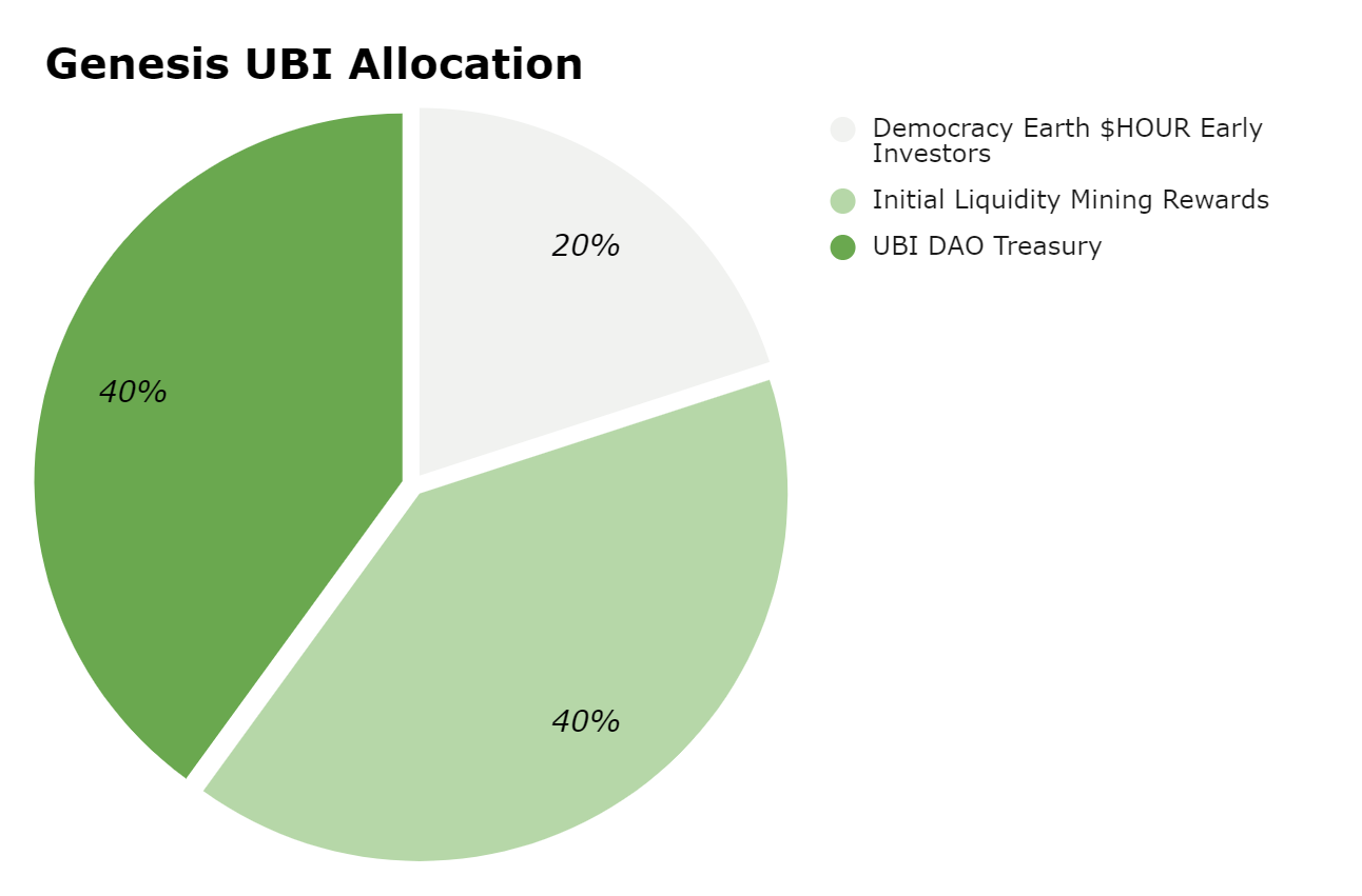 - 20% to early contributors to Democracy Earth’s HOUR token (rebranded to UBI).
