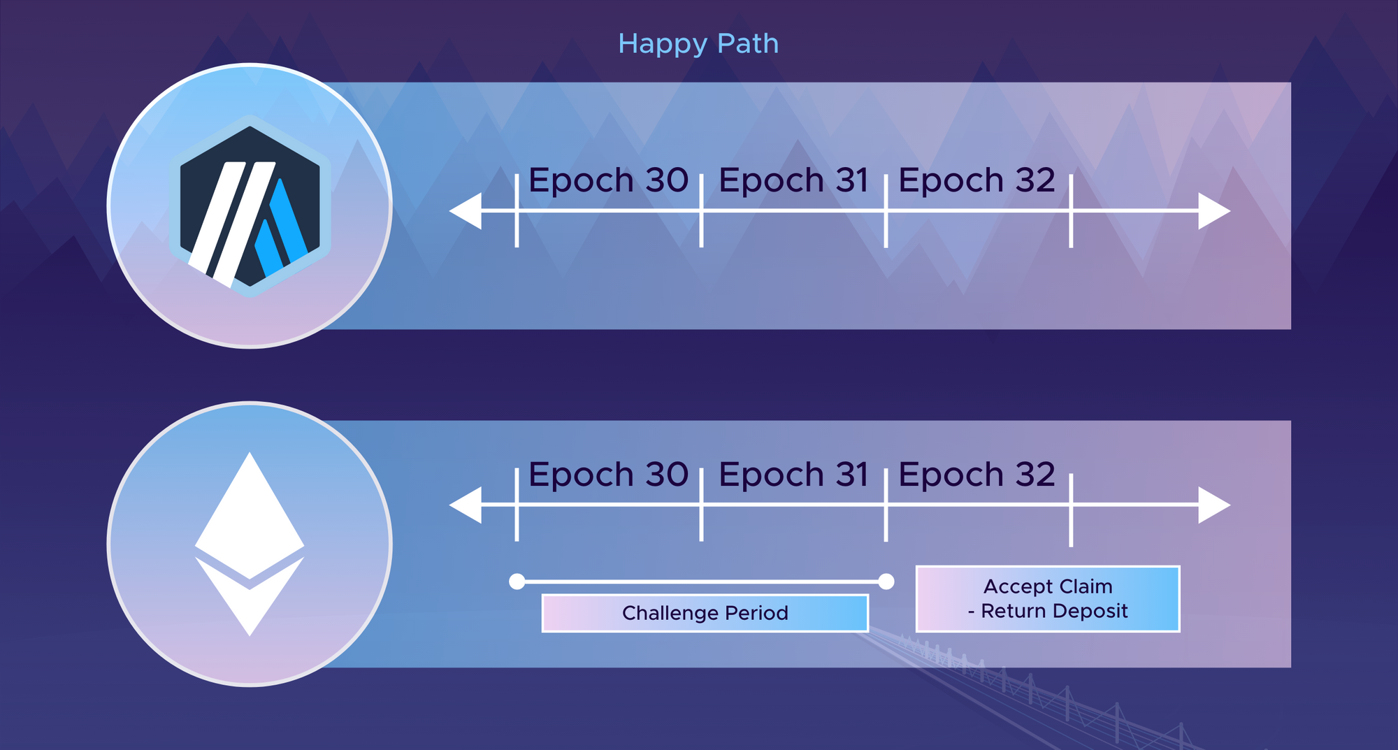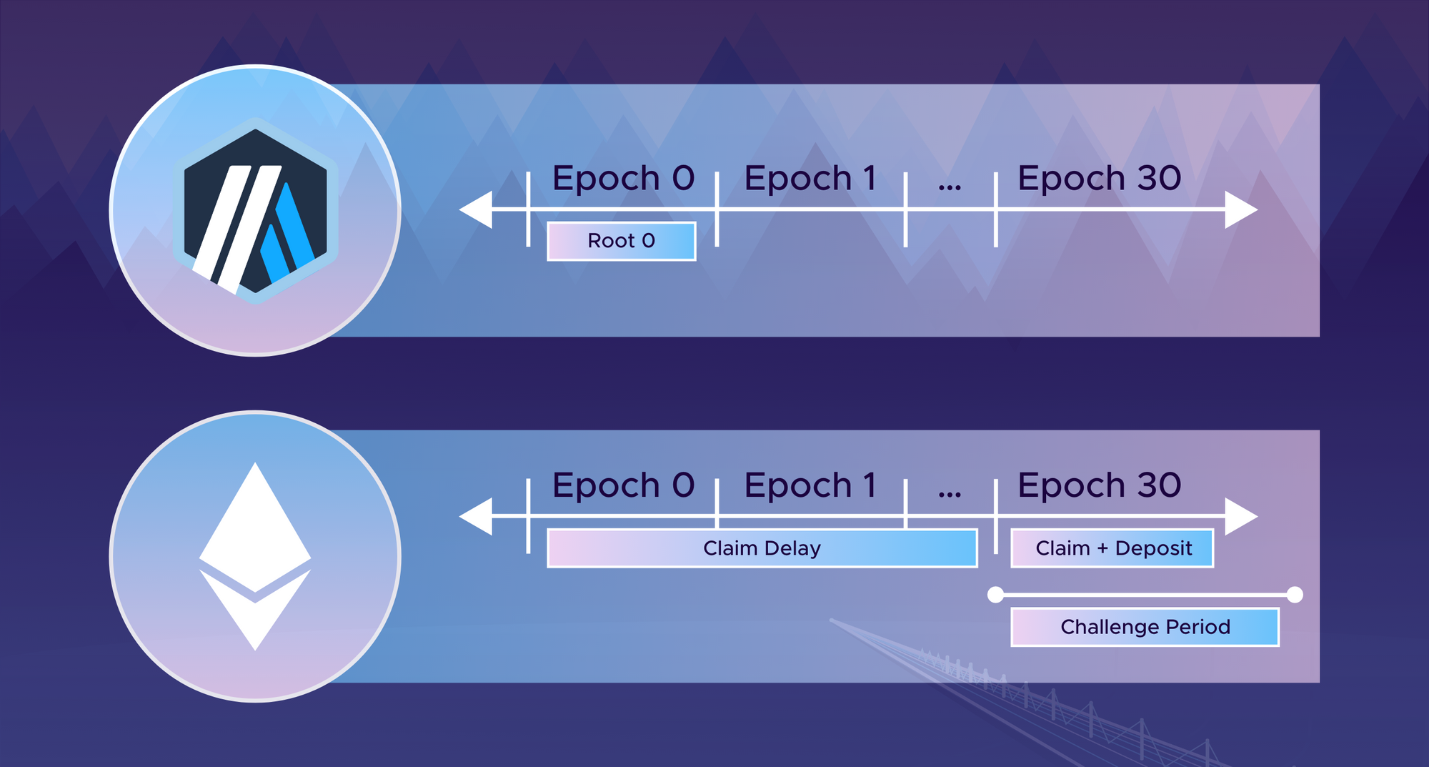 We split time into epochs. You can imagine an epoch is around an hour in length. The idea is that on Arbitrum, on the sending side anyone can save the state of the bridge, the Merkle root in a storage slot, for example, in the first epoch (epoch zero) and some time later, after a delay on Ethereum, someone can make a claim right after a delay.