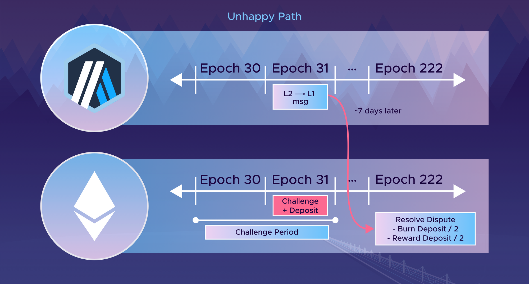 In the unhappy case, if someone challenges the claim, they are mandated to leave a deposit, enabling others to call the native bridges and resolve the dispute between the claimer and the challenger. Half of the deposit is burned, because the claimer and the challenger could be the same person, with the other half being rewarded to whichever party was honest. This is to prevent griefing attacks.