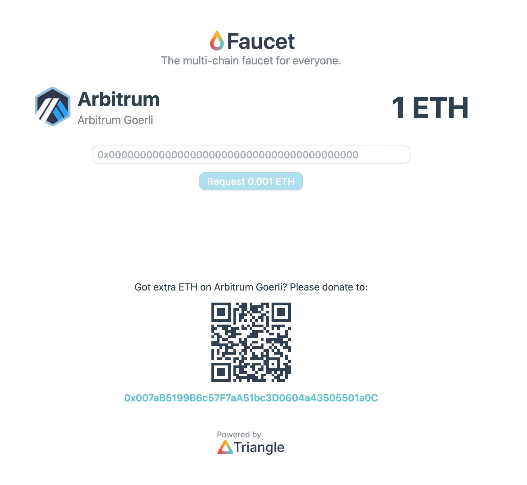 Make sure you have some Arbitrum Göerli ETH in your wallet. We recommend using the Triangle faucet as it’s straightforward and doesn’t require any further verification (i.e. Twitter, Email, x amount of Mainnet ETH).