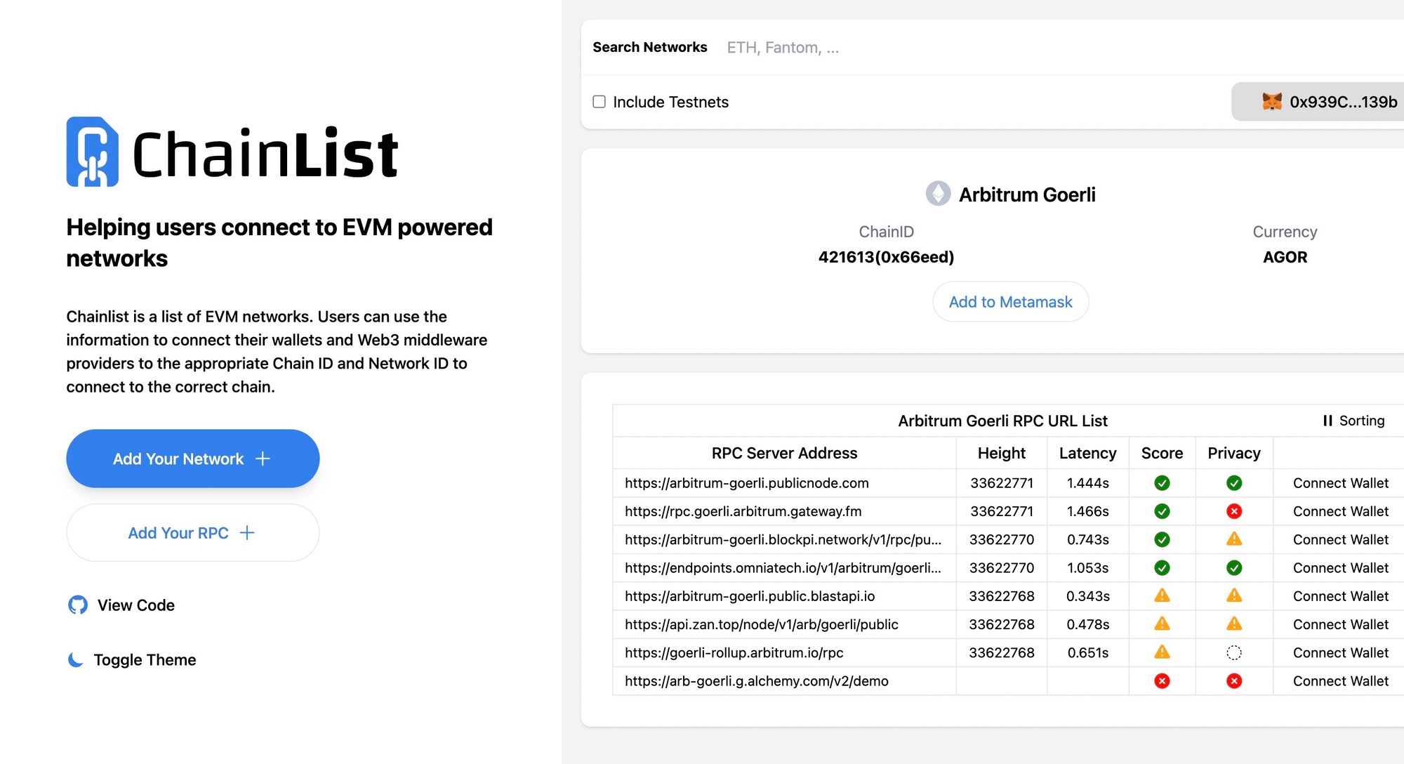 Add the Arbitrum Göerli network to your wallet. You can quickly grab an RPC endpoint here at ChainList.