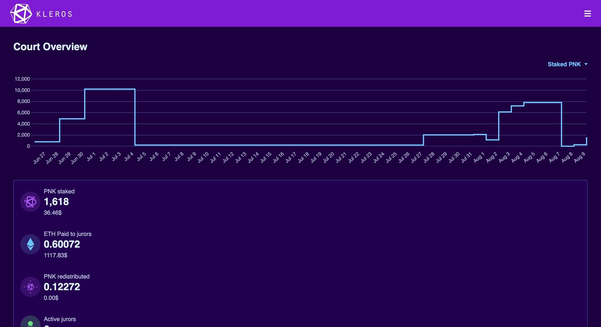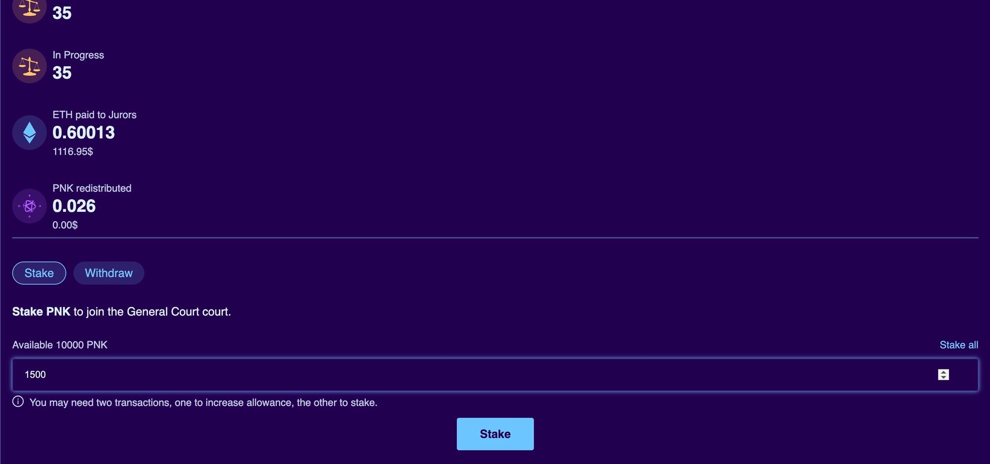 Navigate to the Courts page and scroll down to the staking section. From here you’ll need to pass two transactions - one to approve an amount of PNK, and the other to stake, similar to other DeFi protocols nowadays.
