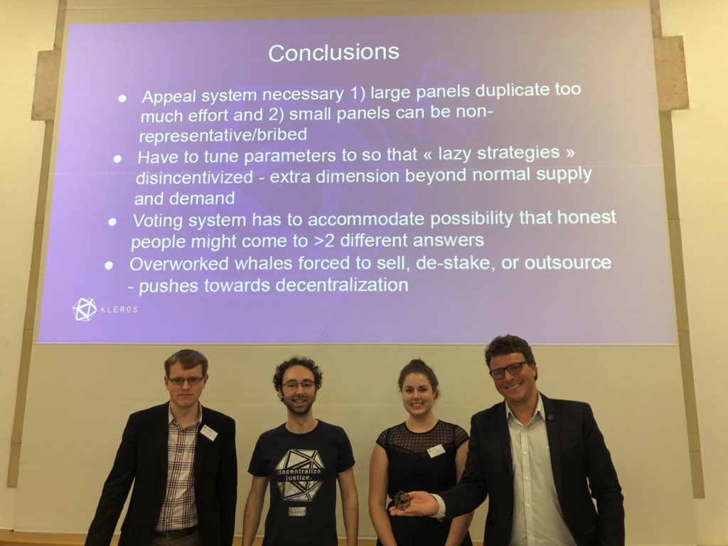 - We made improvements on our previously developed proposals to use Kleros in oracles for real-valued quantities. Work on this subject was published as “A Smart Contract Oracle for Approximating Real-World, Real Number Values” in the Proceedings of Tokenomics 2019, International Conference on Blockchain Economics, Security and Protocols, which won the "Asseth - Kaiko Prize for Research in Cryptoeconomics" conference best paper prize.