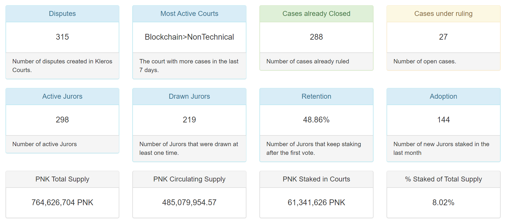 For a stats filled rundown of all open cases, juror odds, staked PNK and more, check out this amazing community created dashboard.
