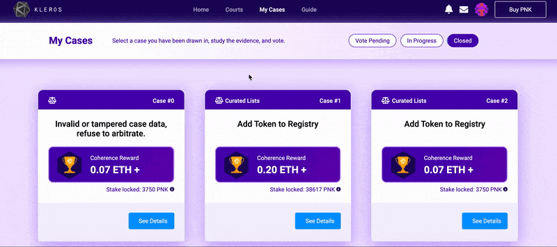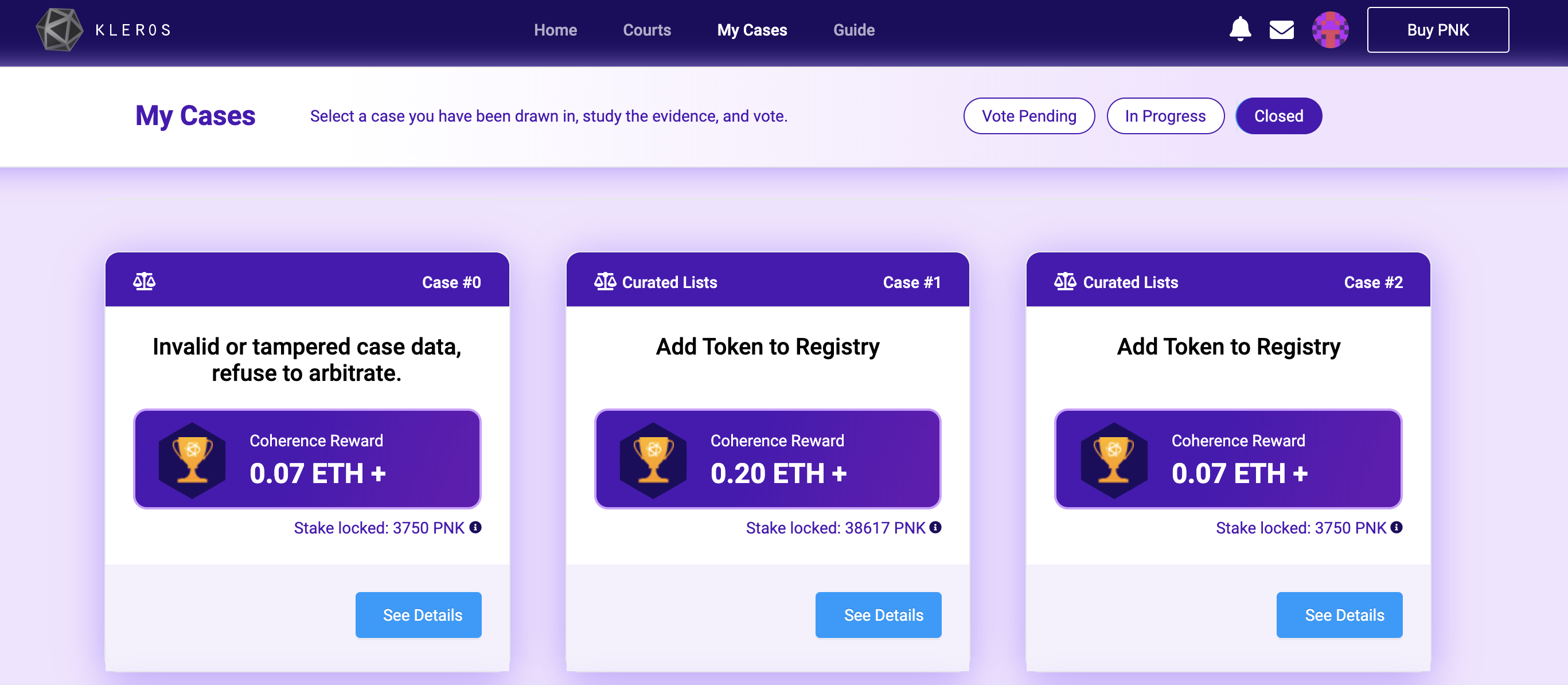 - New rewards section for both ETH arbitration fees and PNK won/lost.