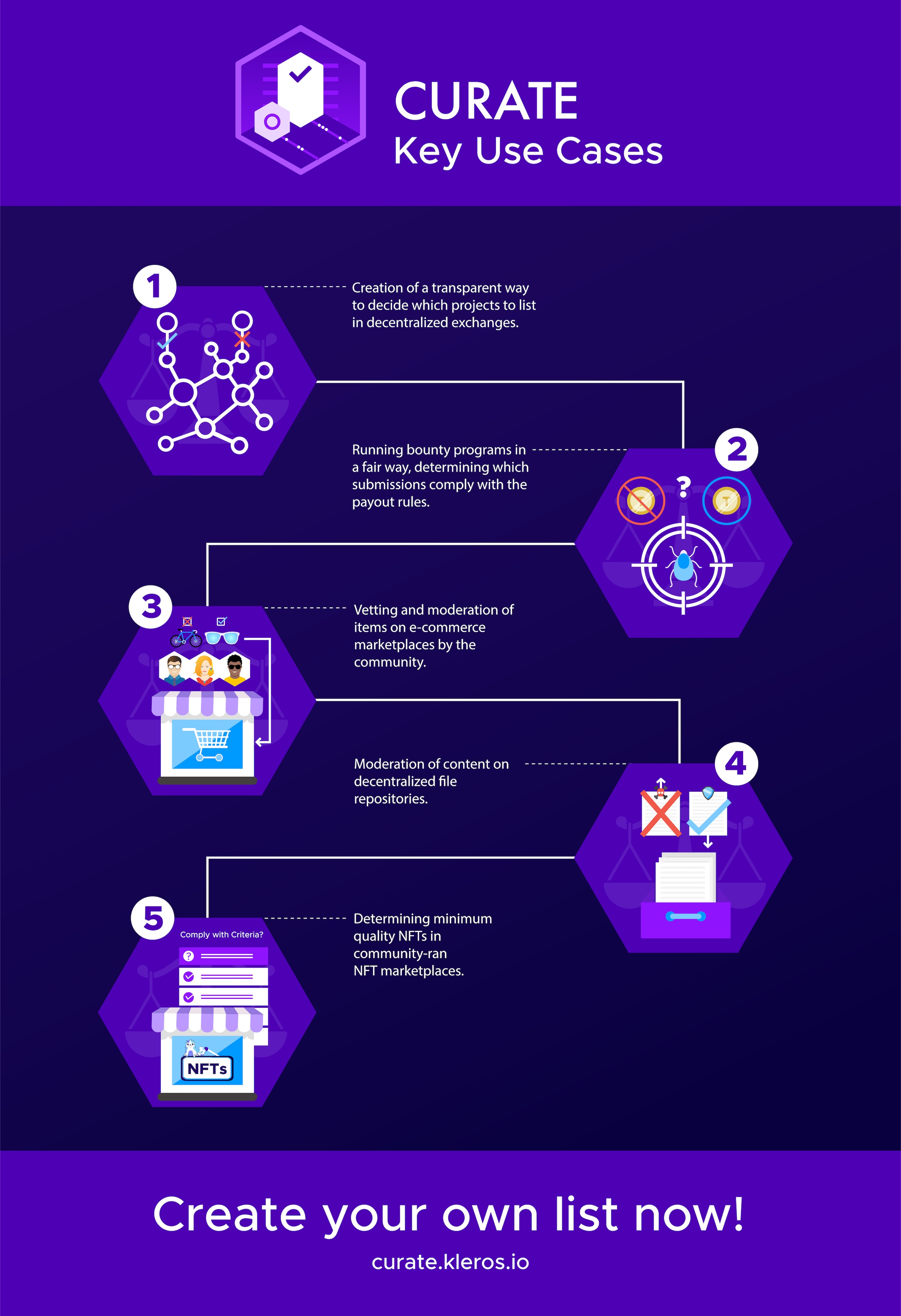 Kleros Curate is an open and permissionless Dapp, allowing anyone to create decentralized lists about any topic. These lists are curated using a mixture of both economic incentives (stake to submit) incentivized jurors (or vetters) who also have a financial incentive to keep the list on topic.