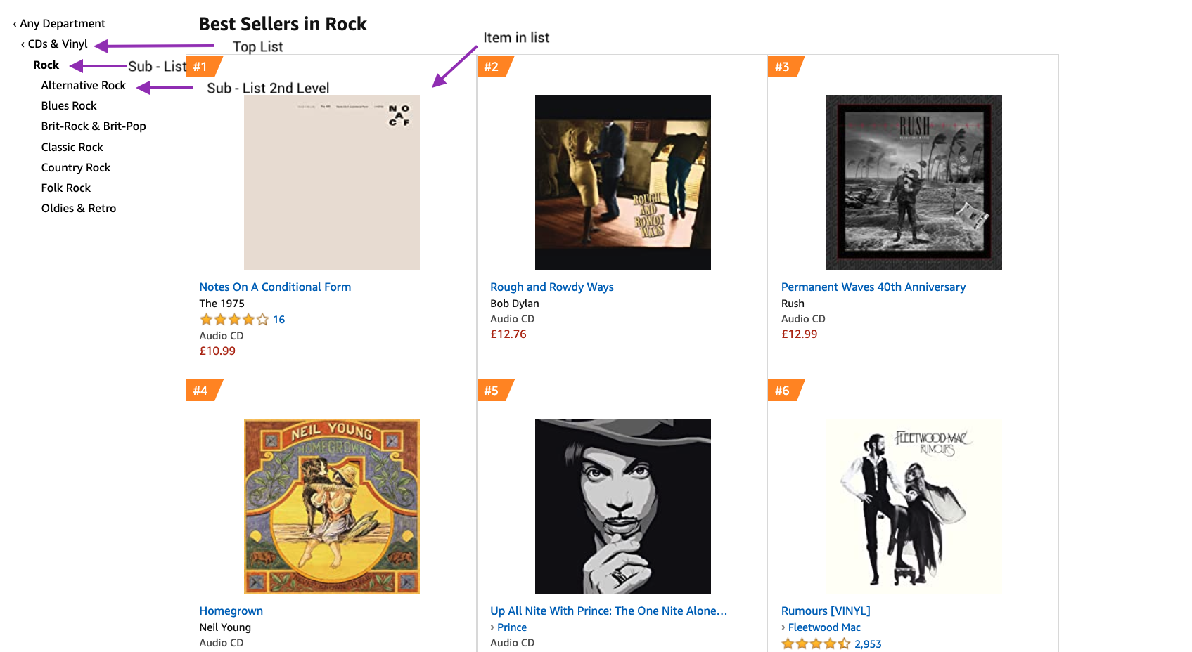 All categories on Amazon are just lists, which in turn contain an undefined quantity of items within them. The same can be said of Spotify. Each category of music (Rock, Pop, HipHop, Classical) are just lists which each contain items.