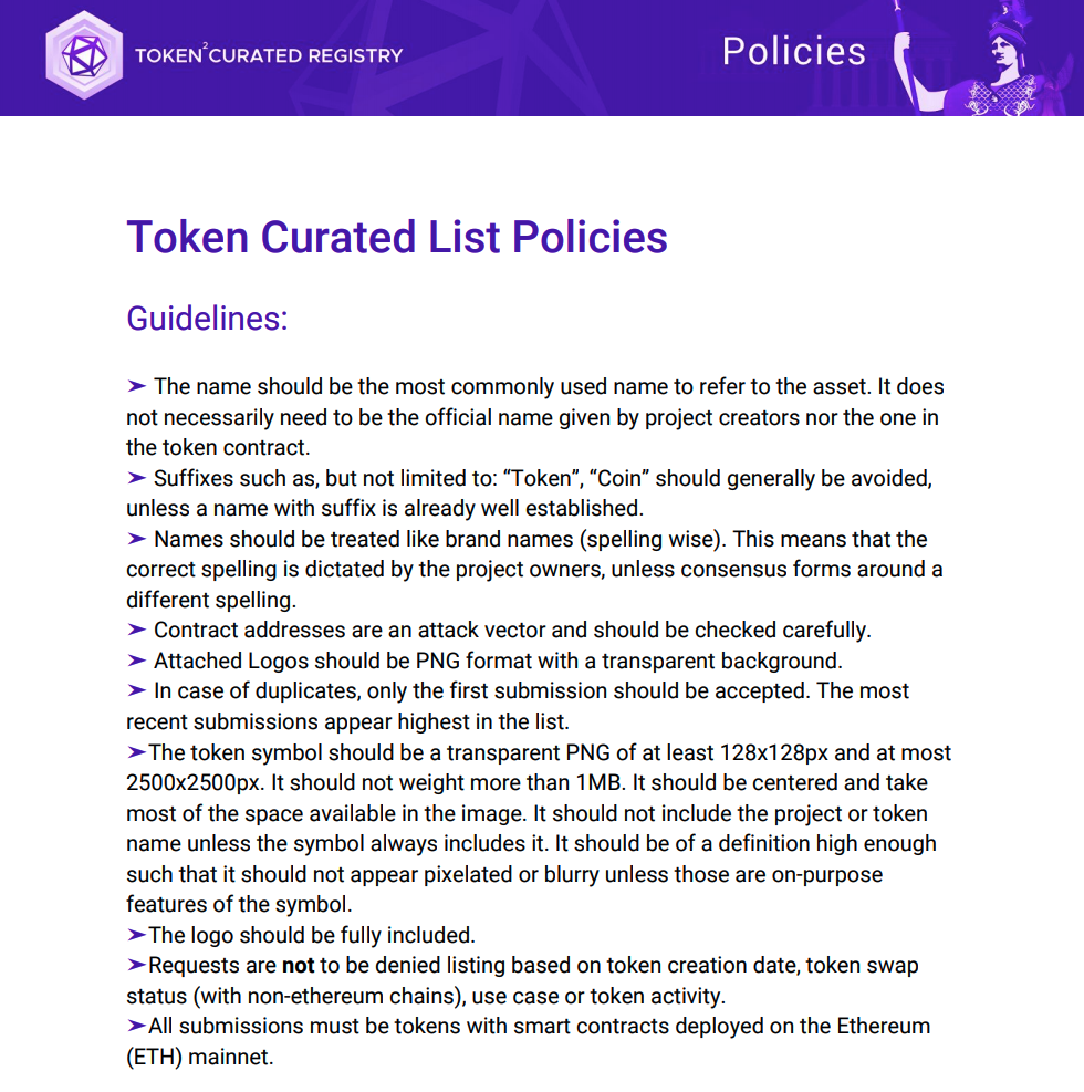 We’ve had one of our lists running for some time which is a collection of Ethereum ERC20 tokens that meet a certain predefined criteria (which we call “The Policy”) as curated by the decentralized community.