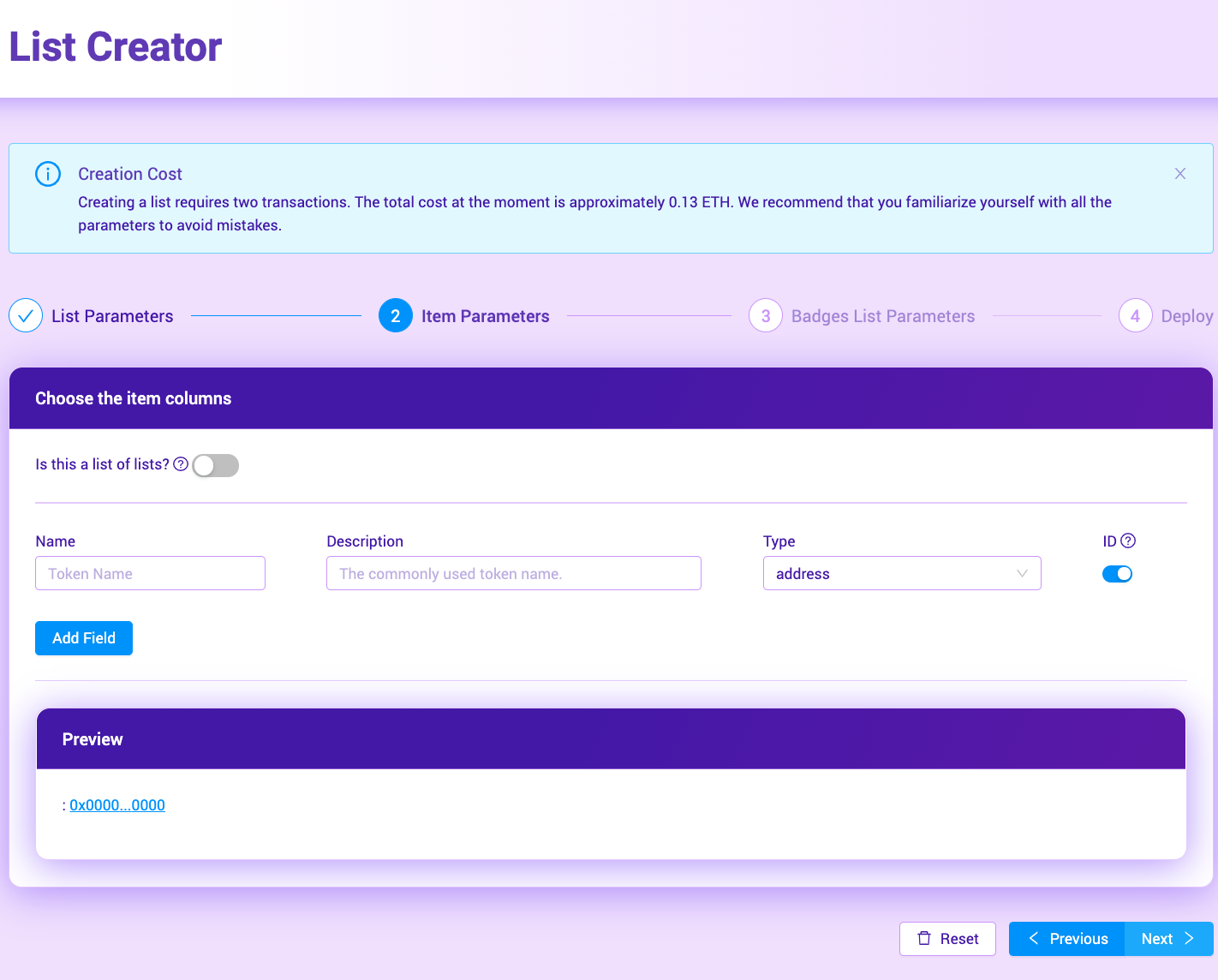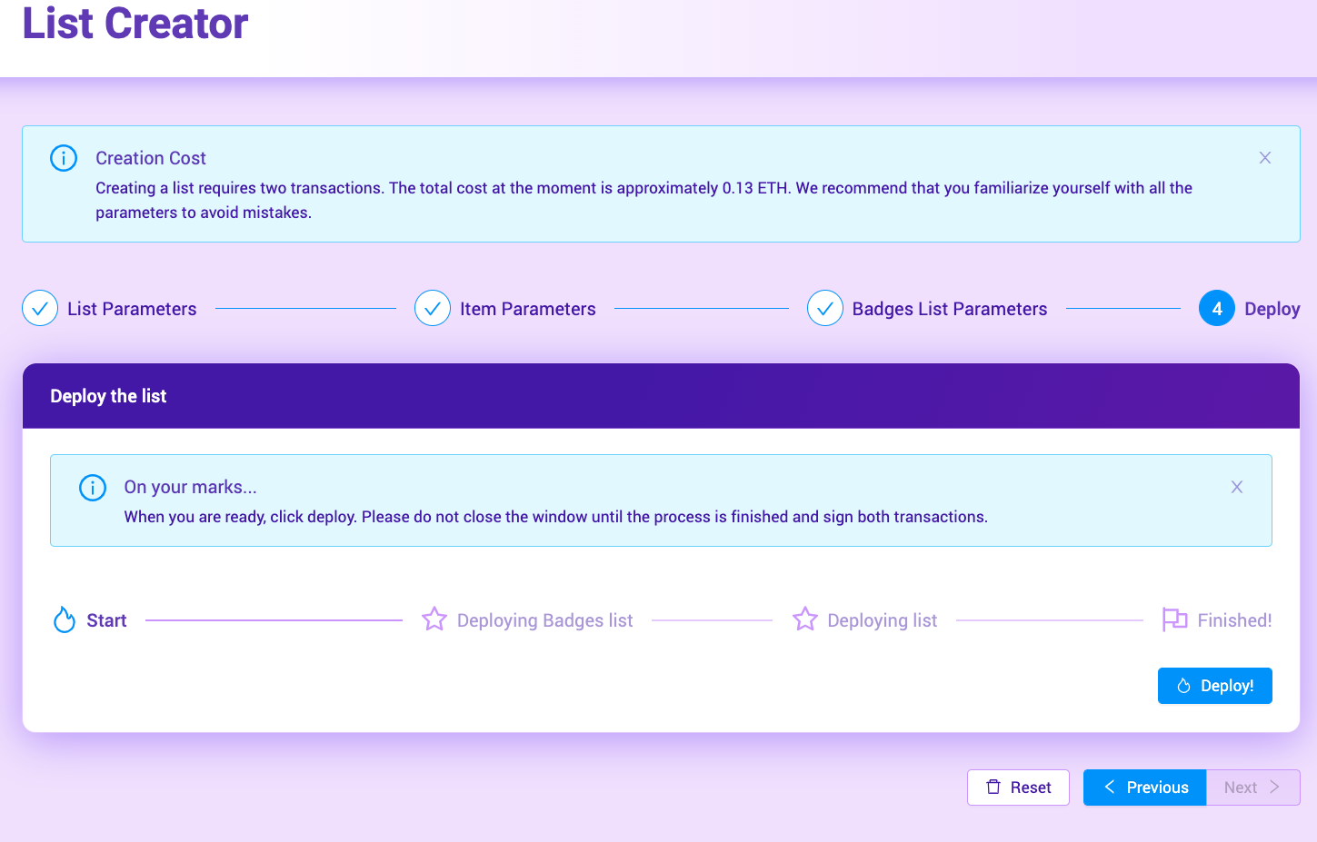 On doing so, you’ll be asked to pay the contract deployment fees (both for the list and the badges. If you don’t need badges, that list is still available for use at a later date).