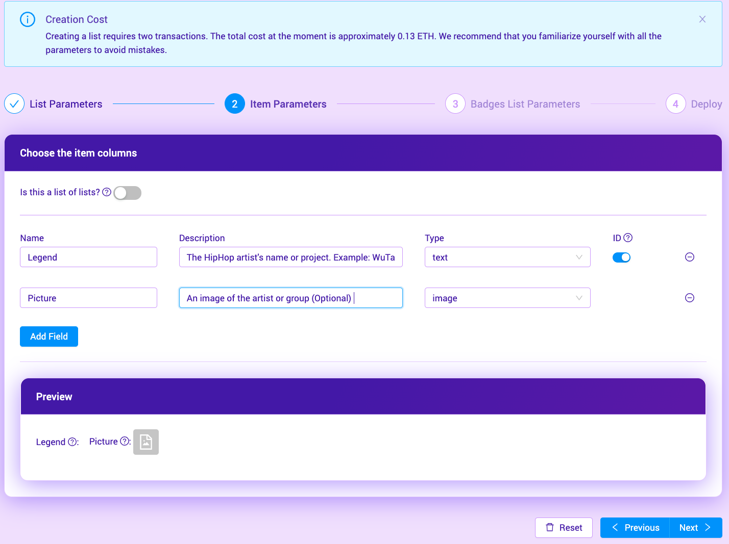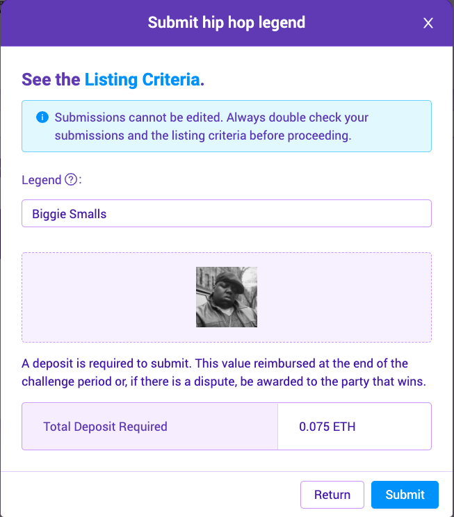 A Hip Hop Legend item ready to submit. Notice the deposit required is 0.075ETH. If the listing is accepted, you’ll get that back.