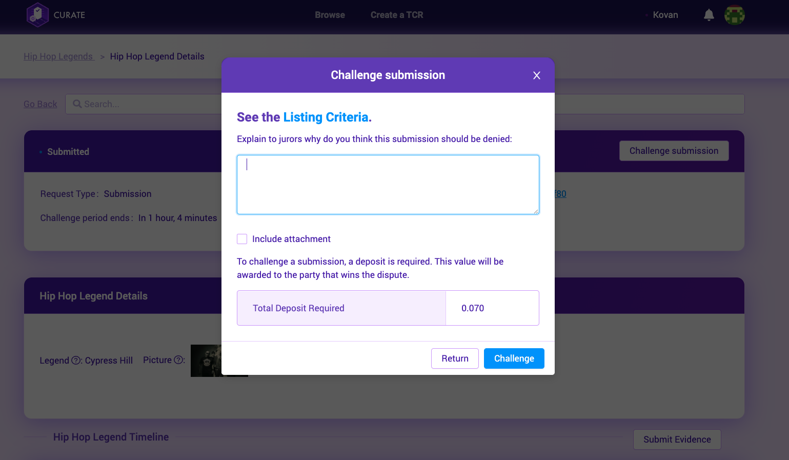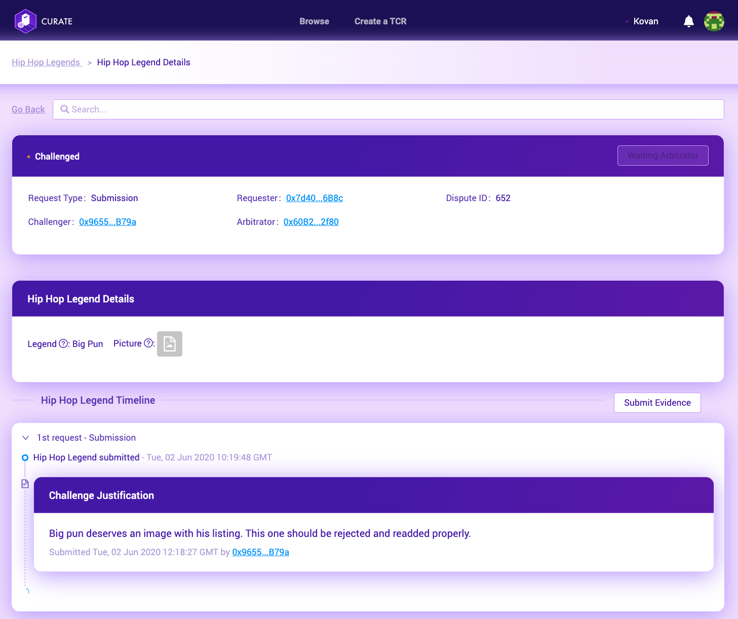 Select the listing you want to challenge and write a description of why you think it doesn’t belong on the list. This information will be sent to Kleros jurors who will make a decision on whether it makes it onto the list or not.
