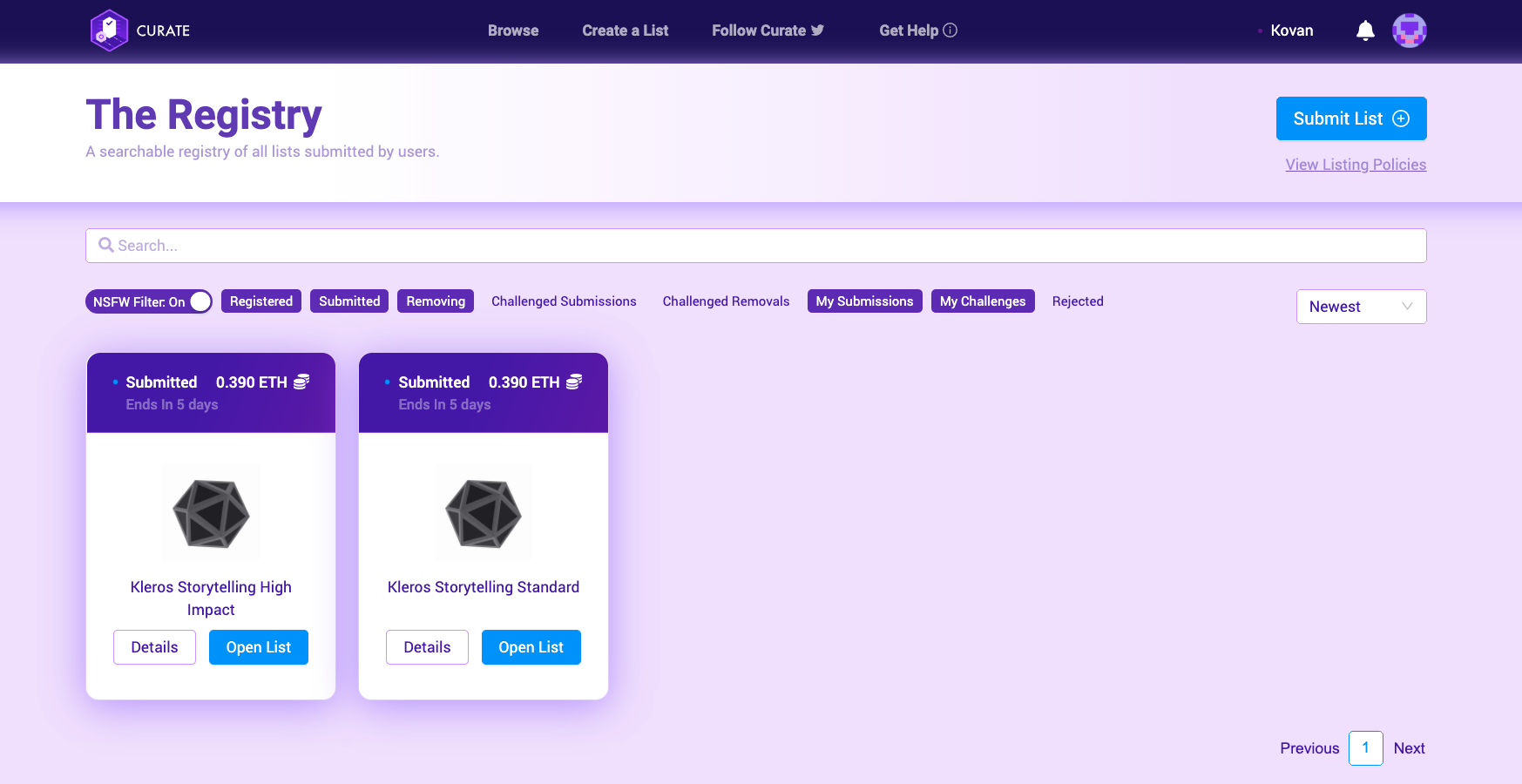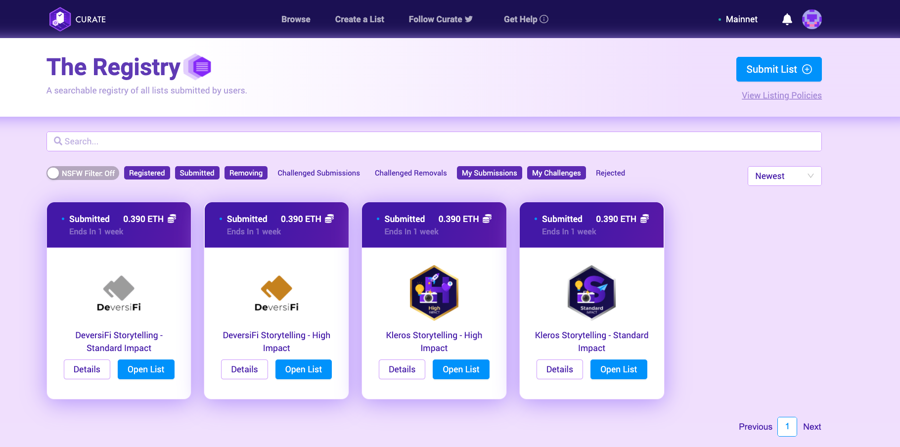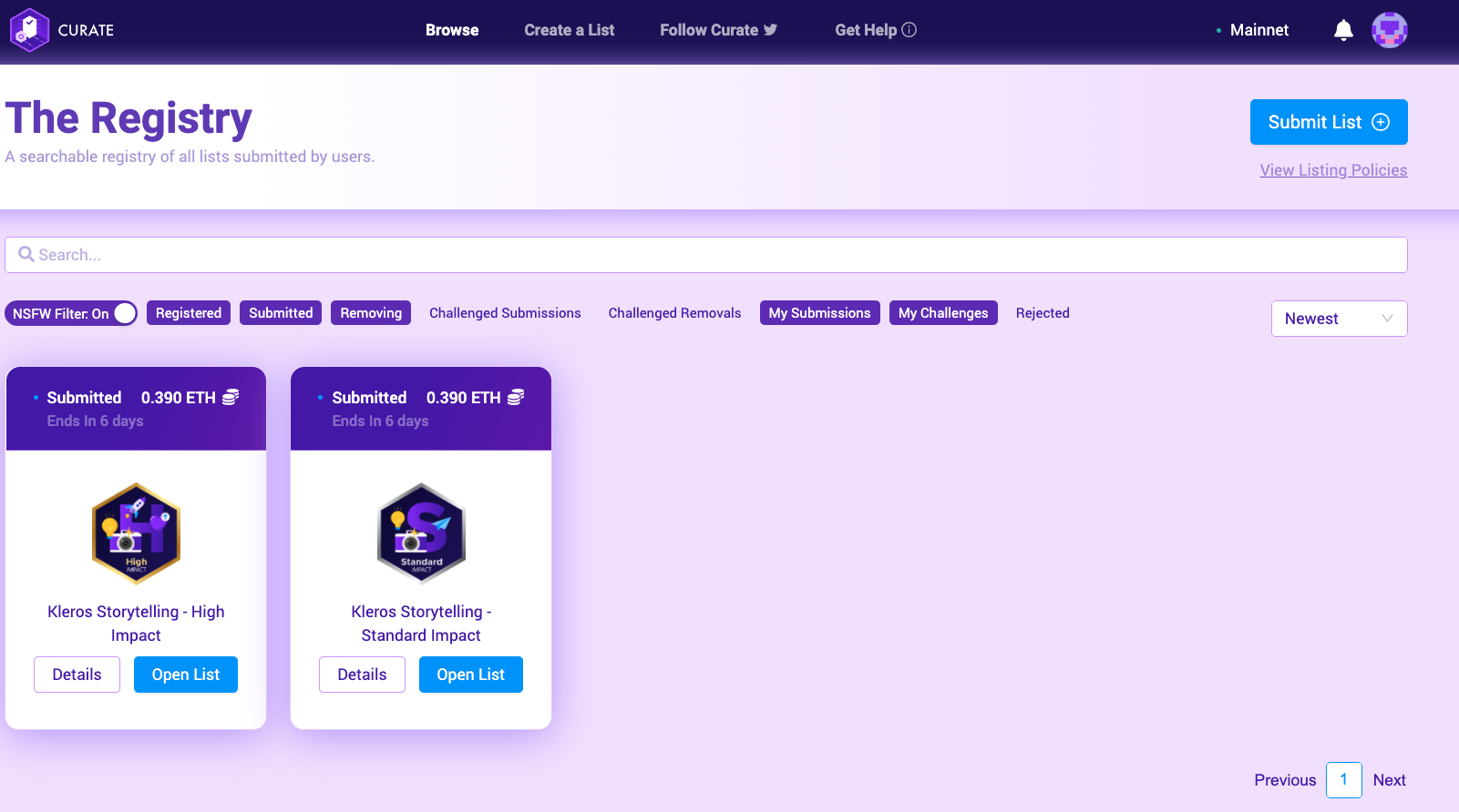 When a user submits an item to Curate, it is first vetted by a challenge period which allows anyone else to challenge that submission. If the submission isn’t challenged, it’s deemed legitimate and on topic, if it is, the challenged submission is sent to Kleros jurors to decide whether it is, or isn’t valid for the list in question.