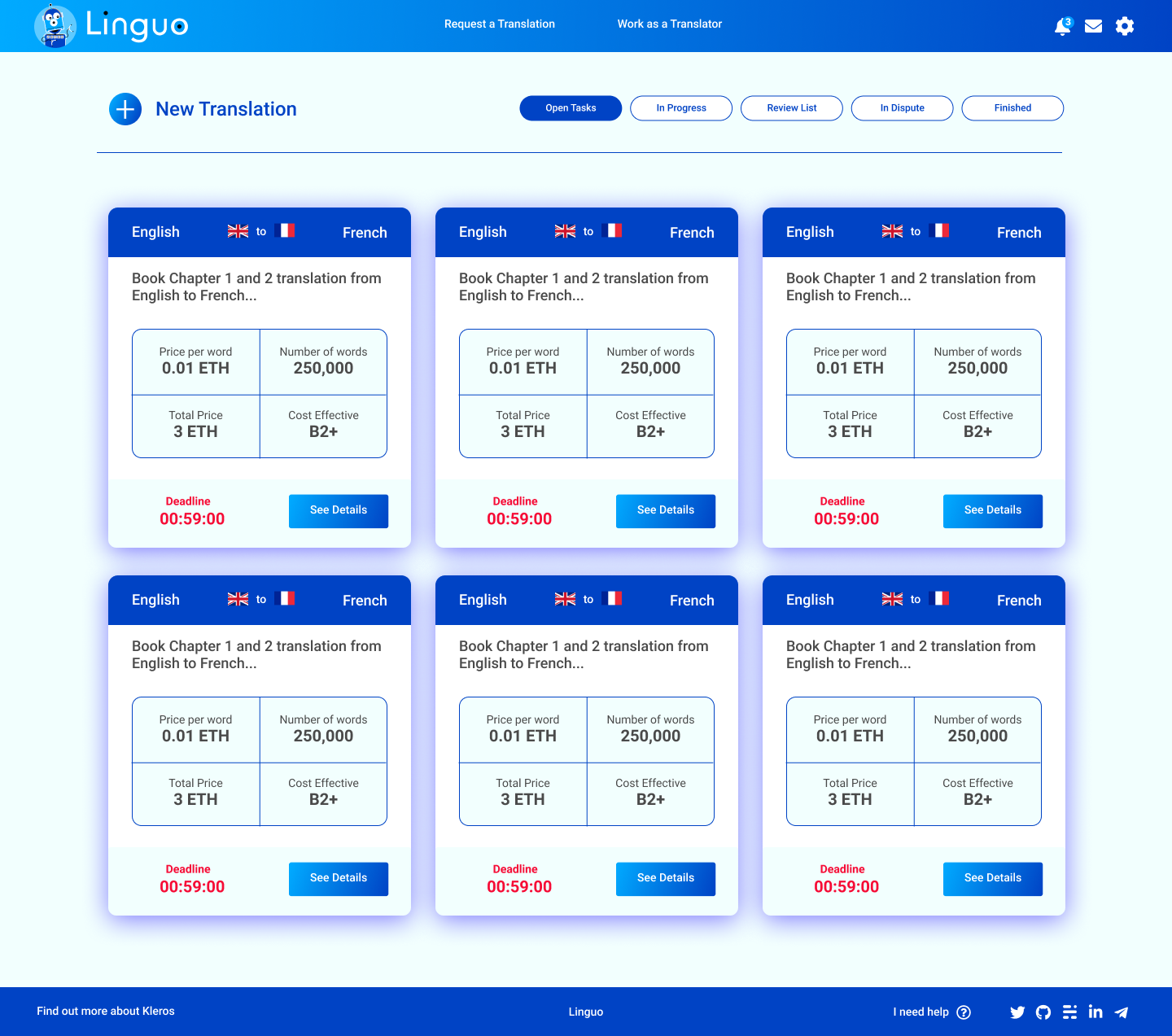 We've been working for some time under the hood of a new translation Dapp named Linguo. It's a decentralized platform in which anyone can submit a document for translation and have it completed by freelancers.