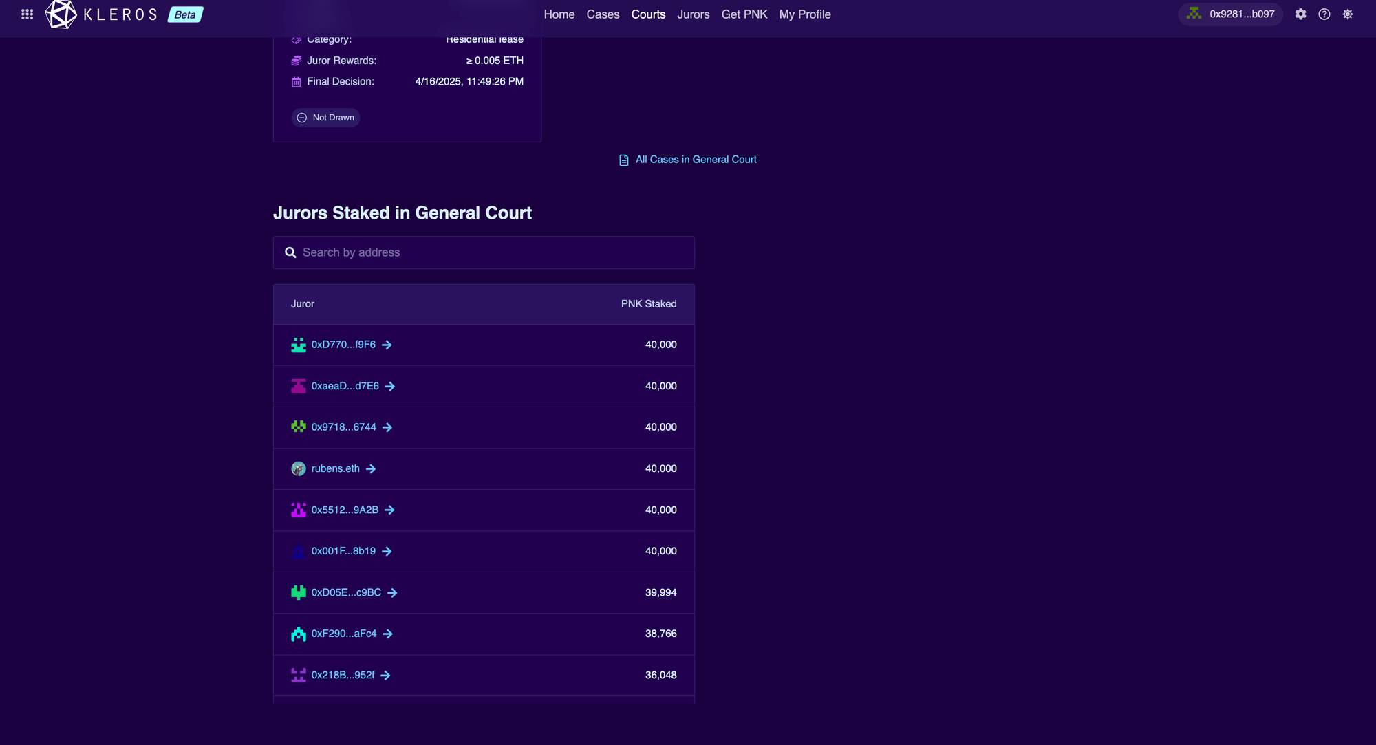 - Added a Top Jurors Staked in this Court section, providing transparency into juror participation