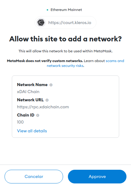 If you have not added xDAI Chain to MetaMask yet, you will be prompted with the following: