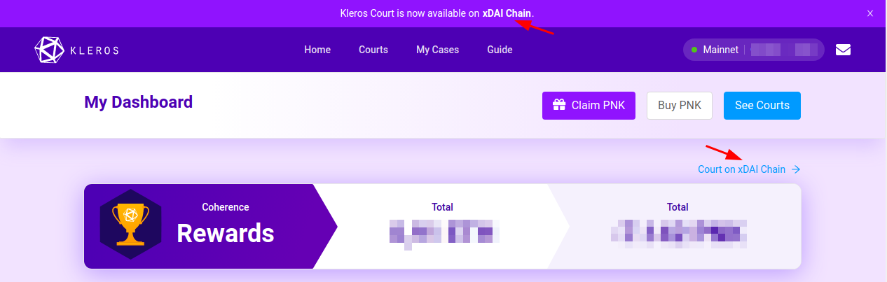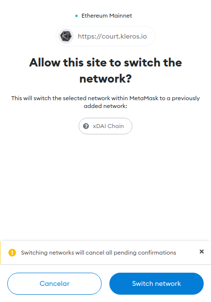 First go to https://court.kleros.io as usual. If you are connected to the Ethereum Mainnet, you will notice some links to the xDAI Chain: