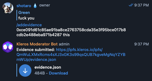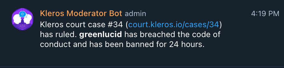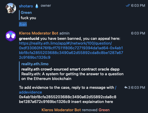 The vision for the product is that any Telegram group owner can just plug and play the bot into their group and benefit from Kleros backed content moderation.