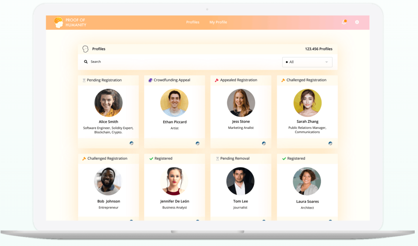 By using learnings from Turing tests and the concept of the web of trust, in Proof of Humanity a user must provide their names, a short description, a photo for display and a video to verify that they are real humans. To be listed, a user must be vouched for by a set number of already confirmed identities drawn by sortition. This kind of mechanism makes it hard to create fake identities, because a successful attacker would immediately lose their identity if they failed in a second attack.