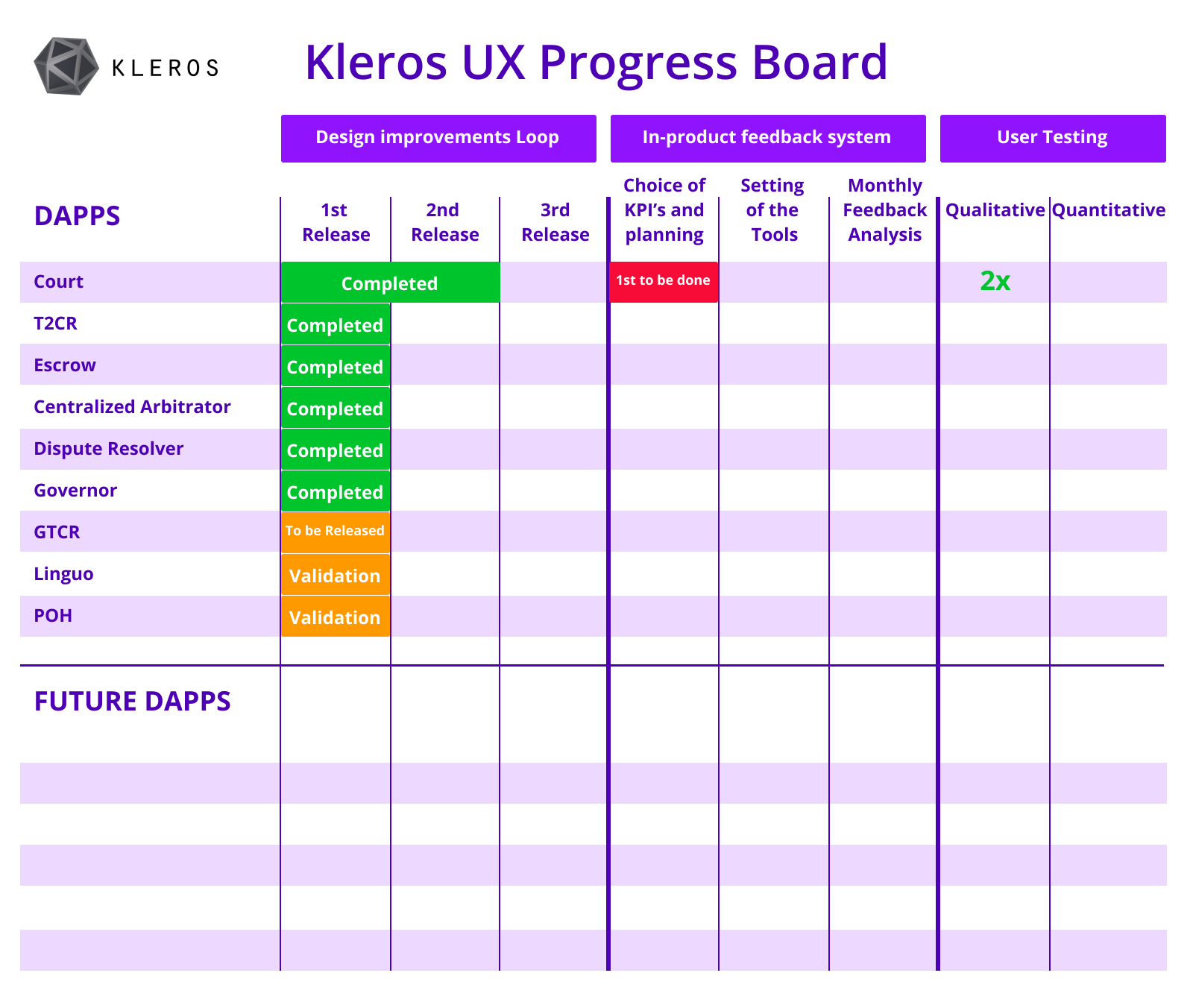 One by one, we plan to start work on the Kleros Court as our central product, then move to T2CR and Escrow, consequently the other DApps: Dispute Resolver, GTCR, Governor, Centralized Arbitrator, Linguo, POH*, as well as the upcoming ones. The data acquired monthly will help us to define what improvements to incorporate in each DApp in order to better fulfill Kleros users’ expectations.