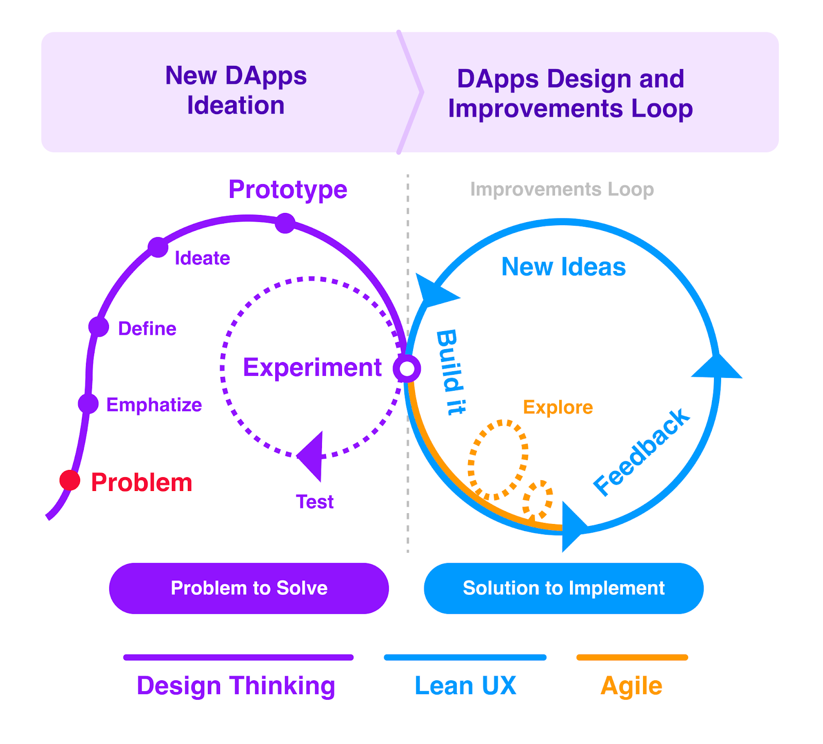 The design process we aim to perfect at Kleros has 2 major phases. First, the ideation of new DApps which involves the Design Thinking methodology and Stanford Legal Design practices to explore a problem and propose a solution based on real user needs.