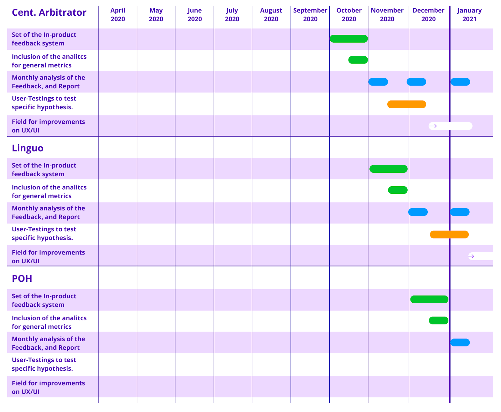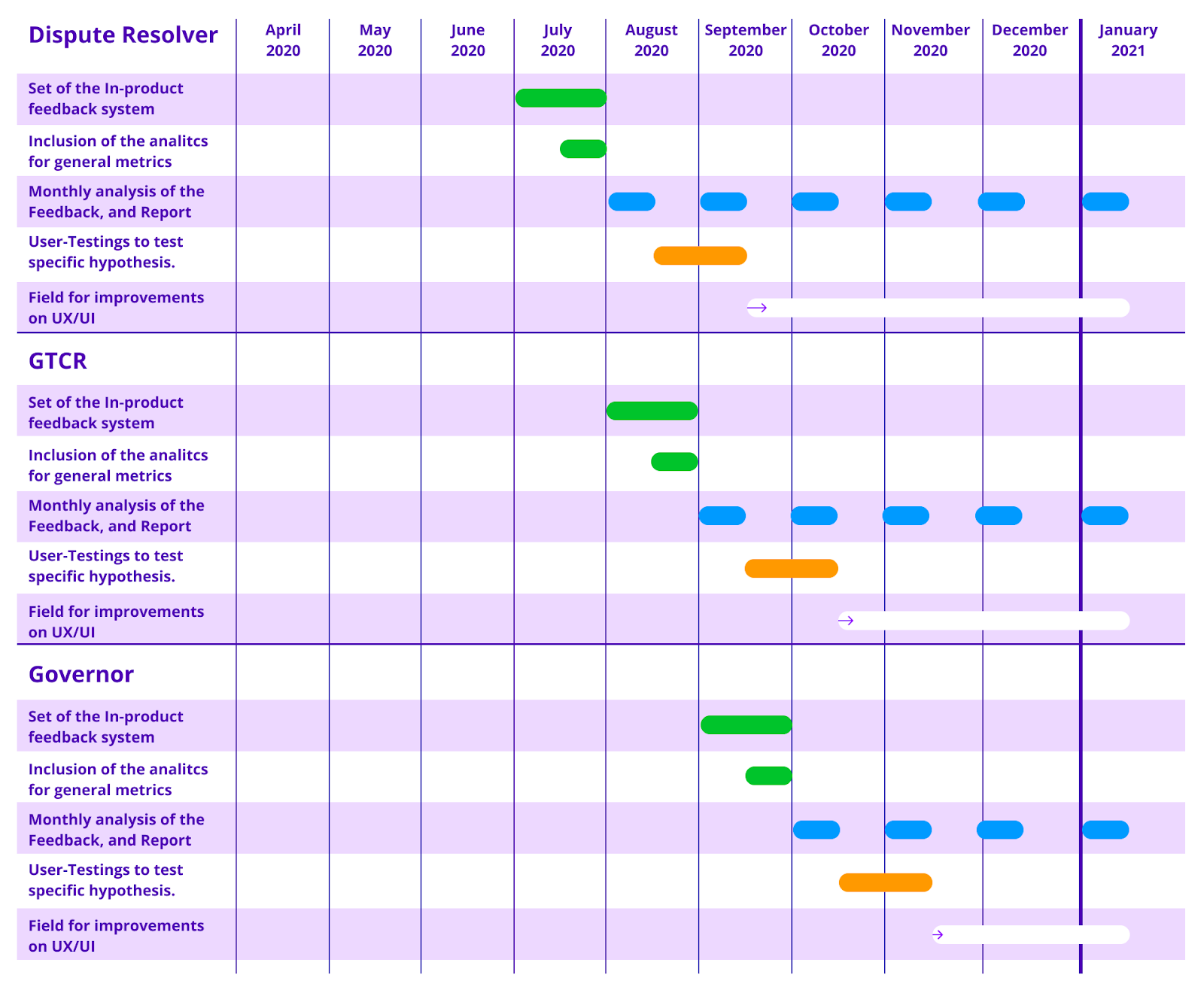In addition to in-product feedback acquisition and analytics, we also plan to be more involved in the conduction of qualitative and quantitative user testings like usability tests, A/B tests and other tests depending on the context and hypothesis to be tested with representative users. The user tests will be conducted in order to validate specific assumptions, brought by users’ feedback or by the team, and validate specific parts of the product’s UX.