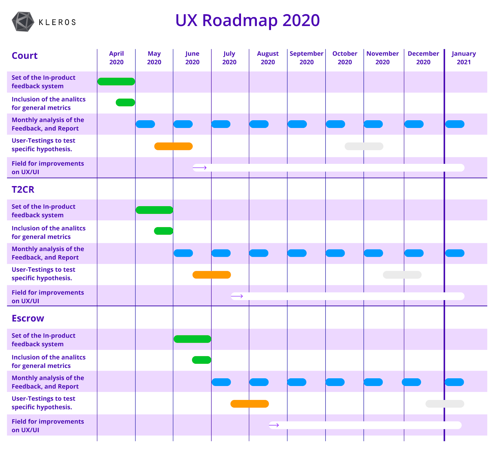 As we consolidate the Kleros ecosystem, which now has more than 8 products and integrations, it is becoming urgent to better track how our DApps are performing, what difficulties our users are facing and what can be done to attend their needs and increase adoption. With that effort in mind, we created this plan to structure the UX at Kleros and extract relevant feedback data from our products’ users more efficiently, thus base our future improvements on the data acquired.