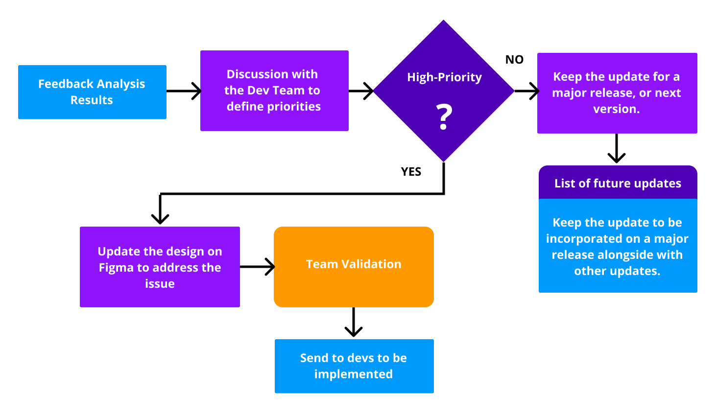 After the monthly analysis of the feedback received and user testings, we start processing its results. It works as a loop of constant improvements, fed by the data acquired. The following image illustrates how we deal with the results: