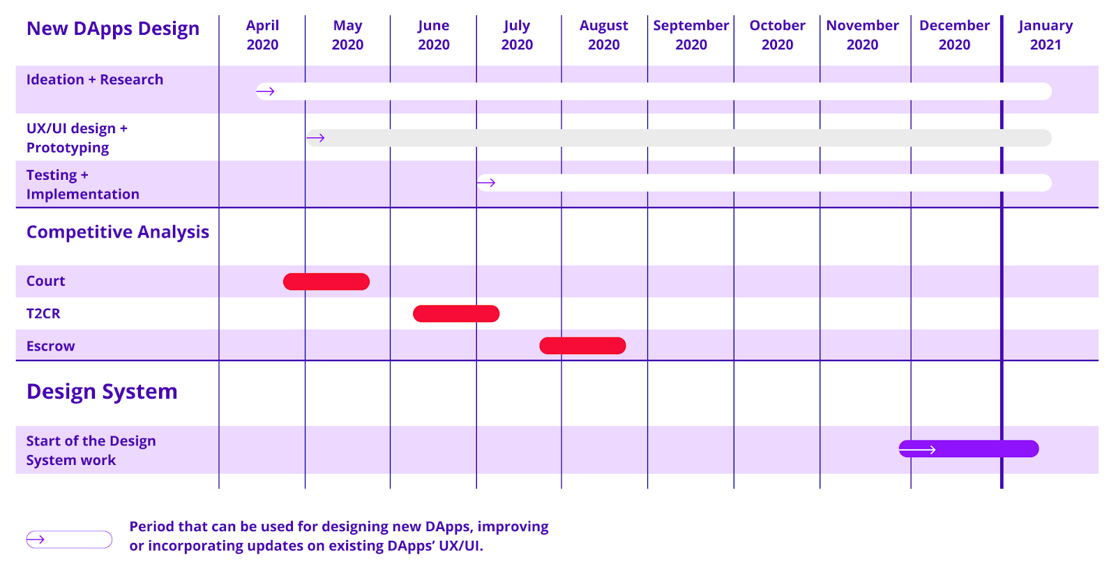 What do we plan to do? Analysis of our DApps main competitors to identify gaps in the market, strengths, weaknesses, opportunities, and threats (SWOT analysis), as well as points that we need to explore to improve our DApp UX and reach. This involves testing our competitors' products, and analysis of their strategy. Concluding the competitive analysis, we’ll also produce a detailed report with insights from the data collected.
