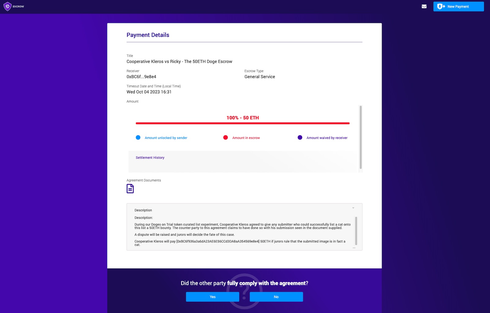After a decision is made, the 50 ETH will be released to the winning side. The outcome of this process shall be considered final.
