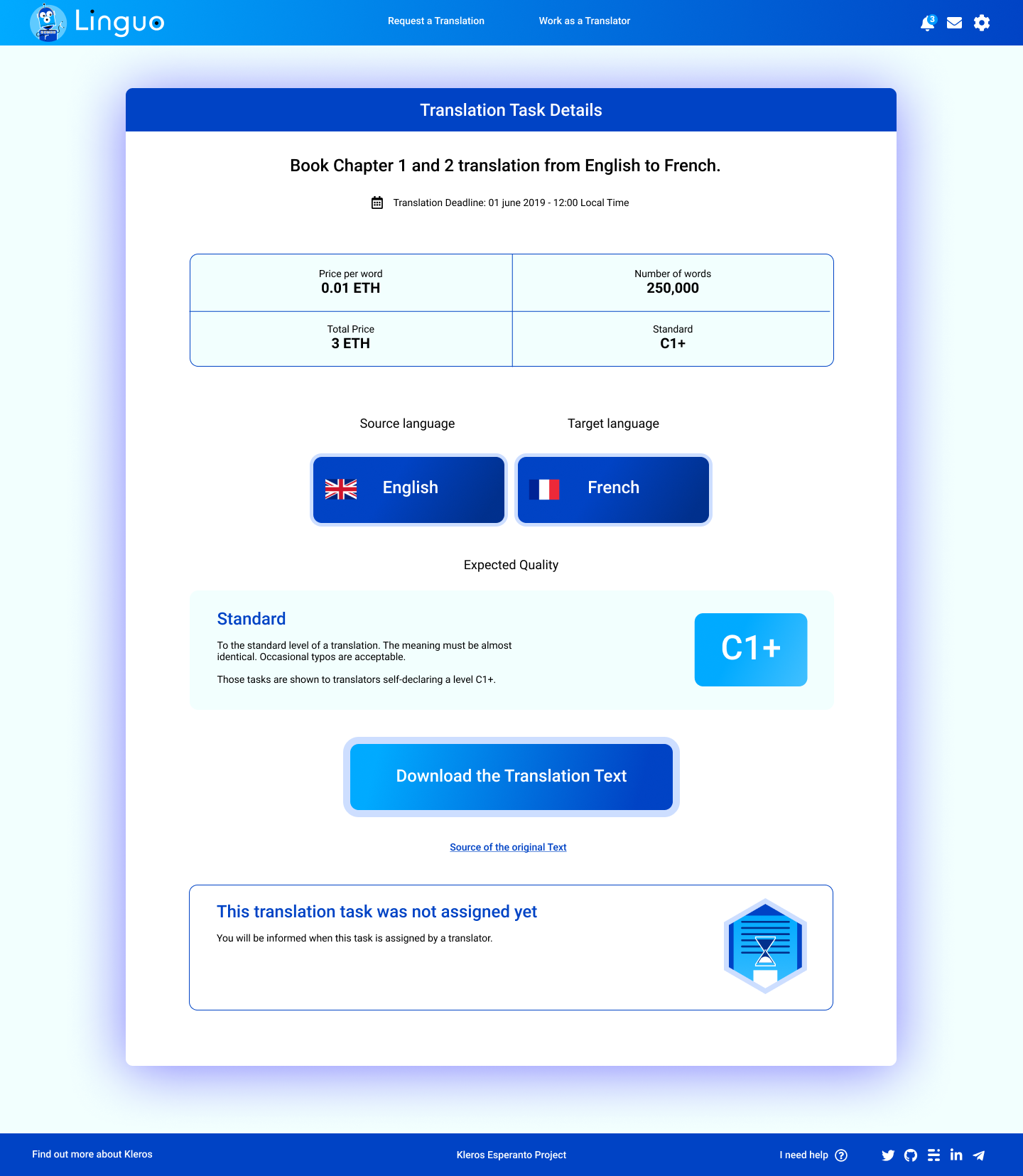 Alice decides that she wants a book chapter translated from English to French. She opens Linguo and specifies the translation level as at least C1. She also specifies translation deadline, and a minimum of 1.03 ETH and maximum of 5.16 ETH she is willing to pay.