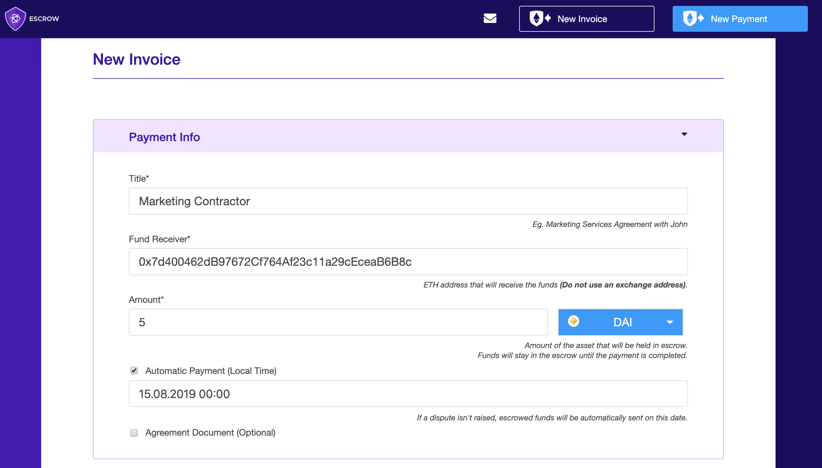 Head on over to our Escrow Dapp to begin with and click on 'New Payment'.